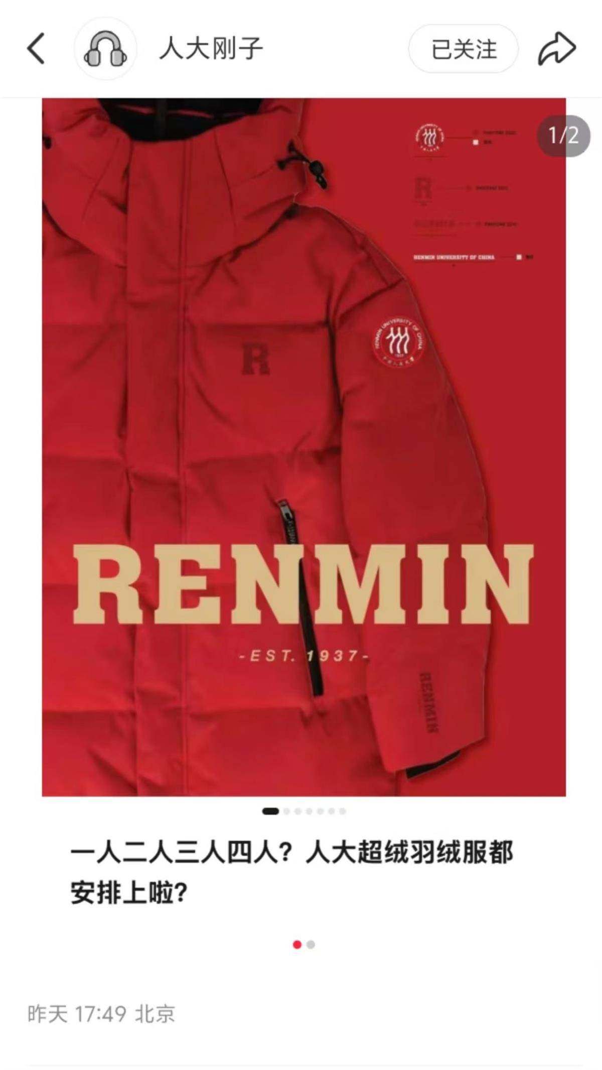 11日,极目新闻记者联系上销售该羽绒服的人大红创中心,一名工作人员回复称,这几款羽绒服为今年新品,首次推出“人大红”配色,近两日上线后销量可观,目前已有款式出现断码,“各款都比较受欢迎,学生、校友及教职工都有选购,还有不少校友购买家庭套餐”。学生对该产品期待较高,认为价格划算。