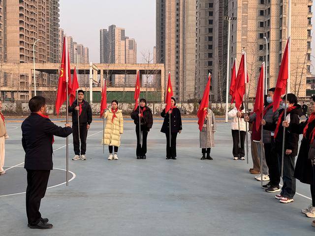 在技能培训环节,活动聚焦少先队工作实操重点,开展了系统性、针对性极强的专项培训。培训现场,王国锋校长结合实例细致讲解正确佩戴红领巾的方法与口诀,通过示范演练与分组实操相结合的方式,确保每位辅导员都能精准掌握动作要领;组织全体人员集中观看全国少工委推出的《新队员入队仪式规程规范》视频,针对入队仪式各环节的流程衔接、细节把控等注意事项进行深入解读;随后,逐一开展敬队礼、呼号、宣誓、出旗、退旗等少先队礼仪的动作要领培训,对队员代表敬献红领巾、颁奖环节礼仪、主题队会整理队伍与报告人数流程,以及升国旗仪式规程等核心工作模块进行全流程规范指导。整个培训过程注重实操演练与互动交流,辅导员们积极参与、认真学习,针对实操中的疑问及时请教、相互探讨,形成了浓厚的学习氛围。