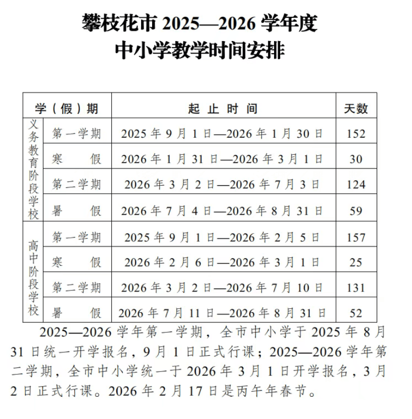 全市中、小学2025—2026学年度(秋季)于2025年8月31日报到,9月1日正式行课。2026年1月31日放寒假;2026年3月1日报到,3月2日正式行课。各幼儿园、中职学校寒暑假及开学时间可参照执行。
