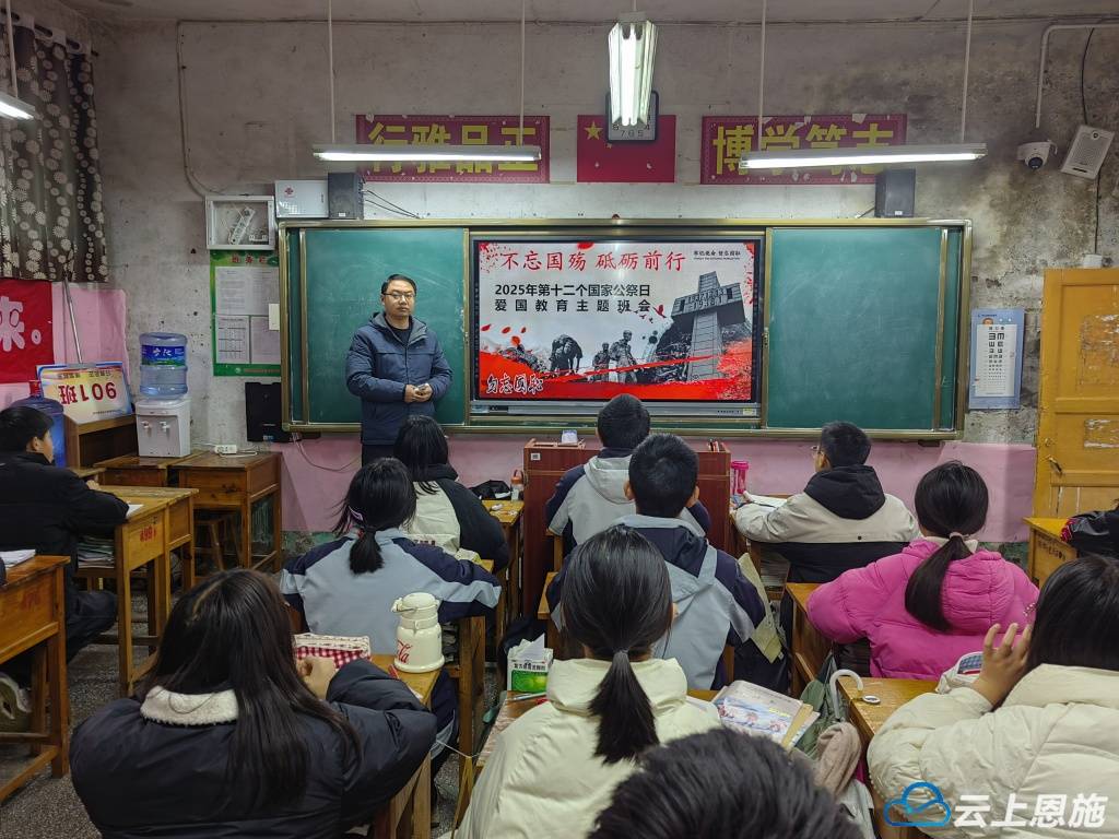 云上恩施报道(利川通联记者 廖原 通讯员谭勇、廖远超)寒风轻拂国旗,哀思萦绕校园。12月12日,在第十二个南京大屠杀死难者国家公祭日来临之际,利川市忠路镇小河初级中学以“不忘国殇、砥砺前行”为主题,开展了一场爱国主义教育活动。