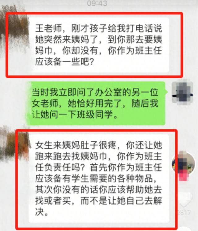 “刚才我的孩子给我打电话说她突然来姨妈了,到您那里去要姨妈巾,您却没有,你作为班主任应该准备一些吧?”