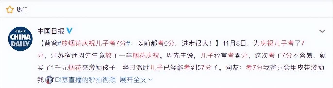 看过一则新闻,周先生为考7分的儿子买烟花庆祝,因为以前经常考0分,这次考了7分,非常不错了。周先生买了1000元的烟花来激励儿子。
