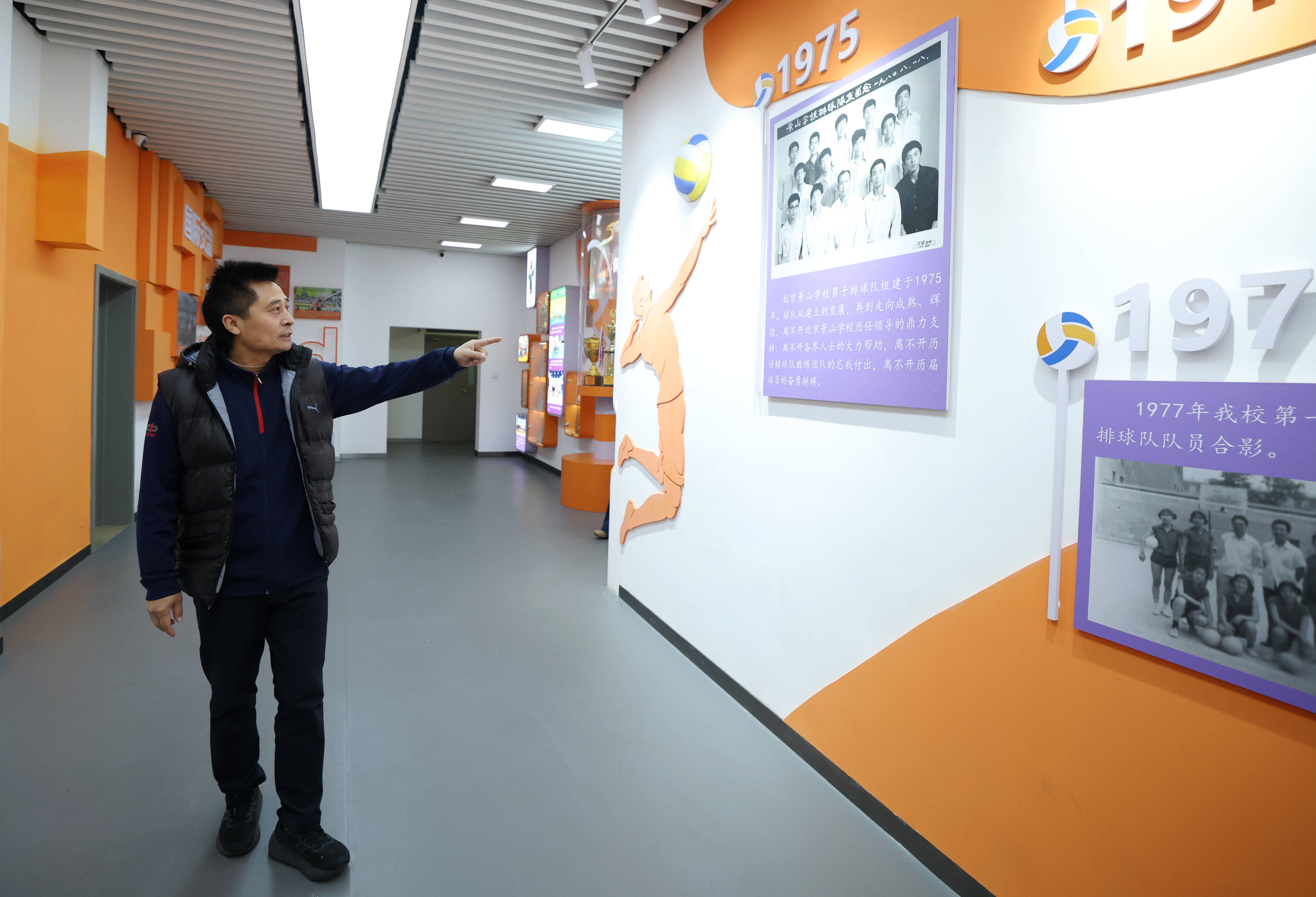 1月8日,北京景山学校排球队主教练李峰介绍球队历史。 新华社记者 张晨霖 摄