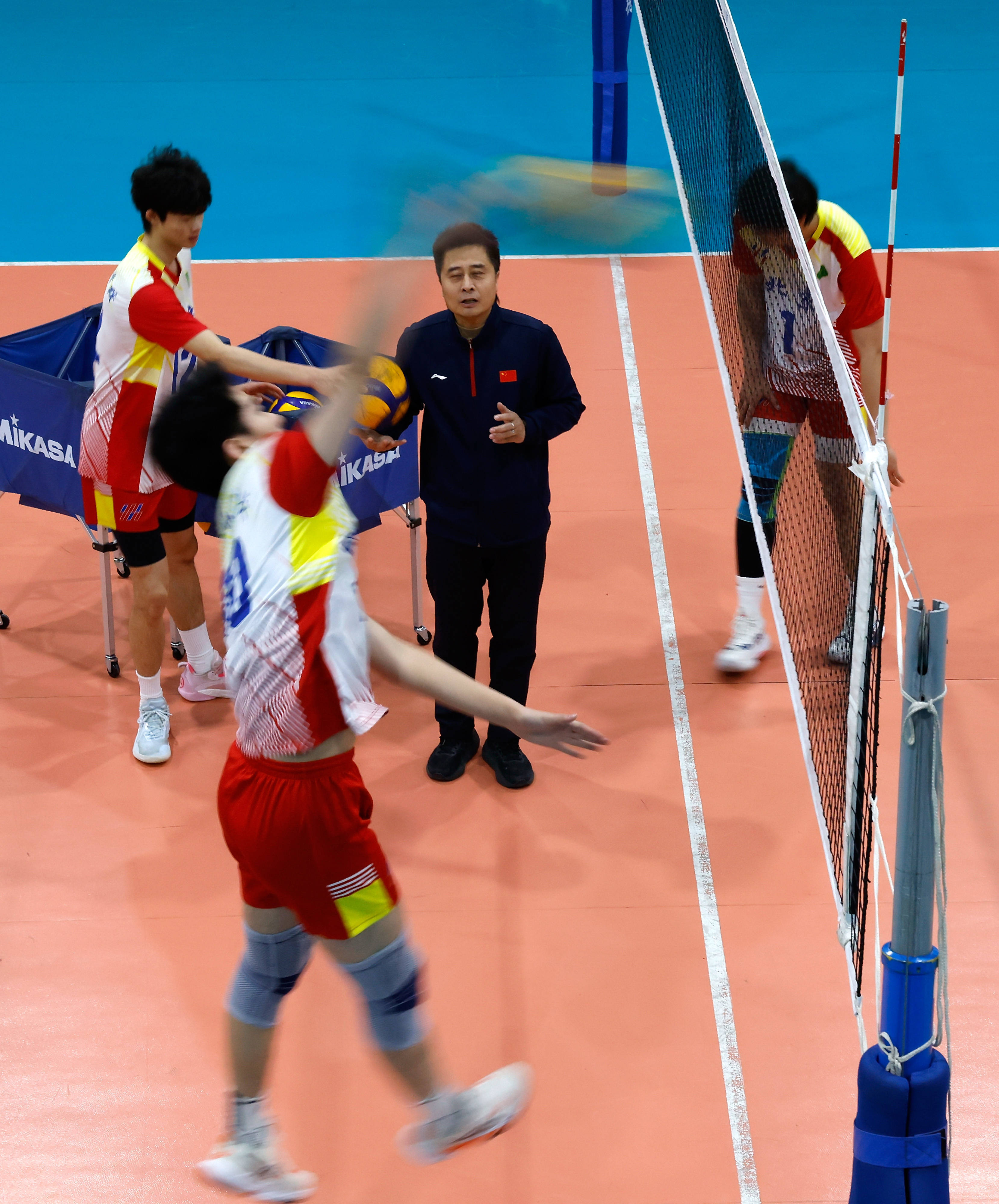 北京景山学校排球队主教练李峰(中)在训练中指导球员(2010年4月22日摄)。 新华社发(受访者供图)