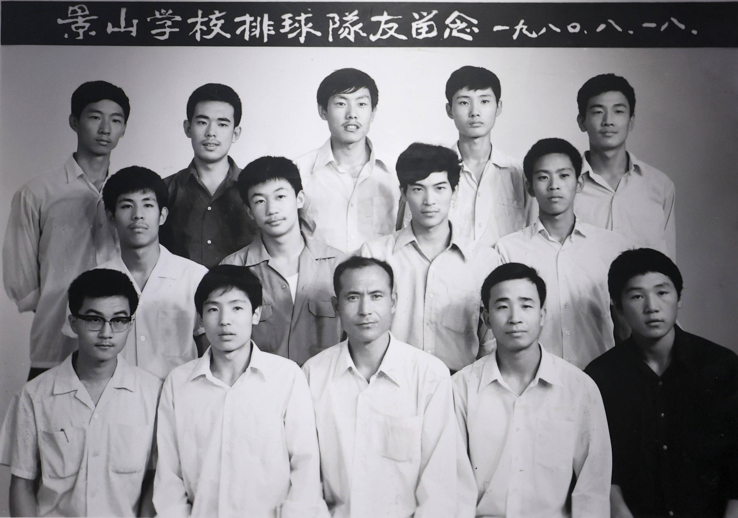 这是1980年8月18日拍摄的第一批北京景山学校排球队队友合影留念(翻拍照片)。 新华社发(受访者供图)