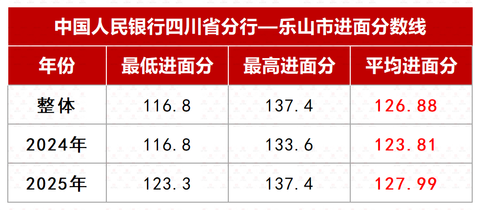 乐山市近两年平均进面分约为126.88分,最高进面分高达137.4分,最低进面分为116.8分。
