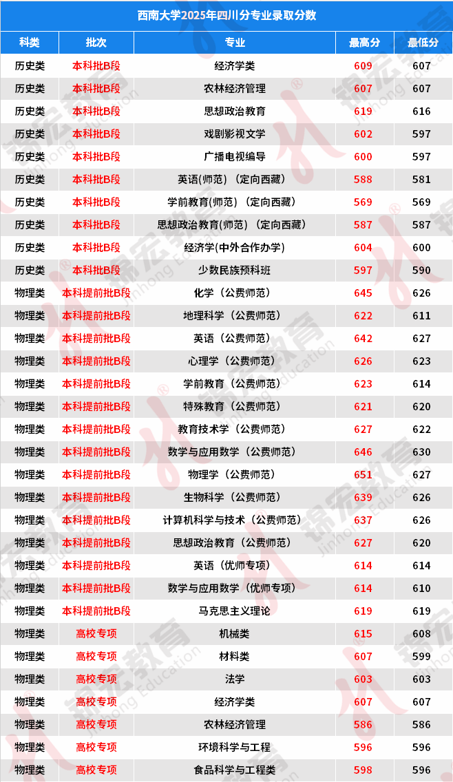 2025年四川专业录取情况:西南大学在川多个批次招生,采用西南大学、西南大学(荣昌校区)分设单独学校代码招生,涵盖公费师范、优师专项、重点马院、国家专项、专项计划、普通类、定向西藏、艺普类、少数民族预科、中外合作办学等多种招生类型。
