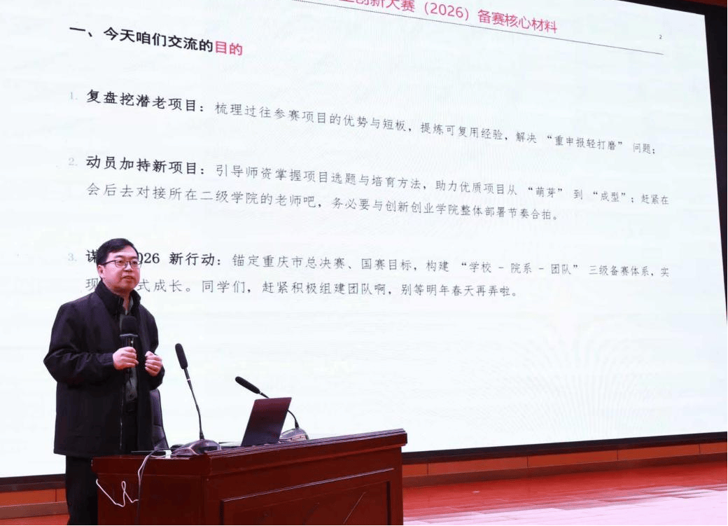 校党委副书记郭光亮回顾了近年来学校在“中国国际大学生创新大赛”“挑战杯”等赛事中取得的成绩,强调这些成果凝聚着全体师生锐意进取、攻坚克难的心血与智慧。他指出,当前国家大力推进创新驱动发展战略,高职学生恰逢好时代、身处好平台、面临好机遇,更要立足专业特色,潜心打磨好项目。他希望各二级学院、各部门凝聚创新创业工作合力,指导教师充分发挥“传帮带”作用,广大青年学子秉持敢闯敢试的精神积极投身创新实践,力争在2026年创新创业类竞赛中再创佳绩。