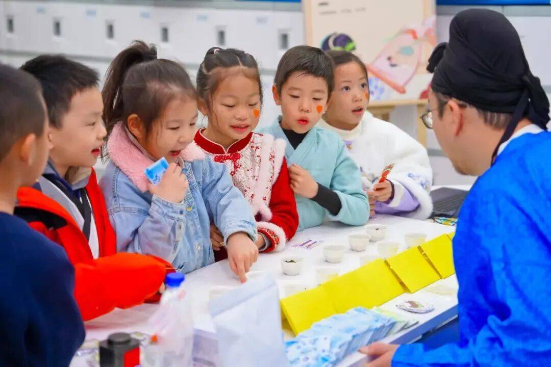 学校还特别打造了八大趣味创意摊位,并实现多维度融合:“智谋摊位射门赛”中,大家在进行数学运算并设计出最优“射门机会套餐”后,方能体验蹴鞠运动;“腾龙体验社”中,大家用身体表现节奏律动,让舞龙动起来;“小小茶博士研究所”里,大家化身辨茶小行家,精准区分六大名茶;“几何美食工坊”内,大家用彩泥与工具包,捏制出不同造型的糖葫芦等,在动手实践中解锁传统美食的别样乐趣;“梨园梦工厂”中,大家头戴精致京剧头饰,模仿经典念白片段;“萌娃秧歌会”上,大家手持手卷花,踩着欢快节拍翩翩起舞;“福气抽抽乐”关卡里,大家凭借准确认读单词的数量赢取体验币,亲手敲响马年祈福钟声,许下新年美好愿望;“AI印坊·方寸宇宙”内,孩子们向智能助手小度抛出关于姓氏的趣味问题,再亲手拓印一枚马年主题红包,让传统拓印技艺与现代AI科技碰撞出奇妙火花。