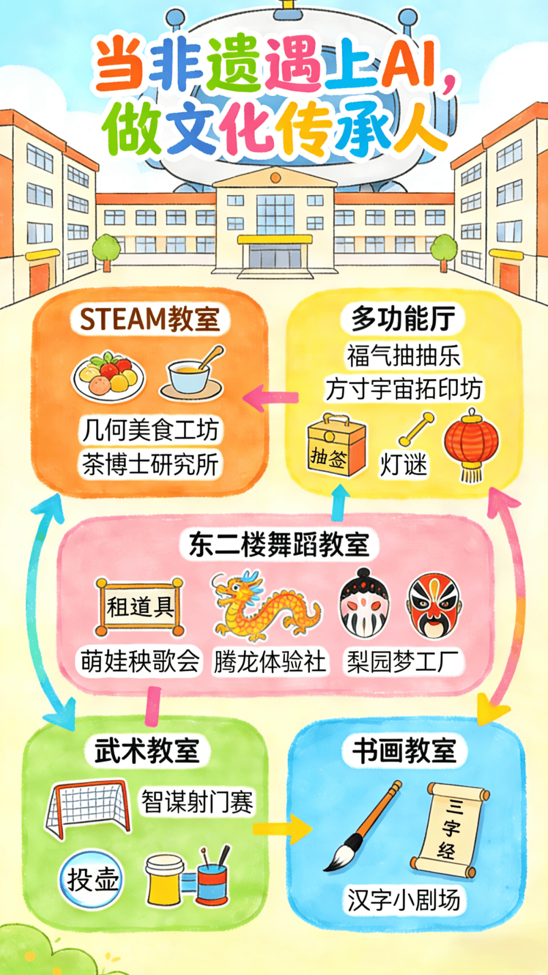 学校乐考以“当非遗遇上AI,做文化传承人”为主题,将非遗项目转化为趣味闯关任务,融入语数英等多学科知识,并巧妙引入AI技术辅助互动,将校园变成了沉浸式的“非遗智慧庙会”。孩子们手持“体验币”,在主题街区中穿梭闯关,完成了一场集知识、能力与文化素养于一体的趣味大挑战。