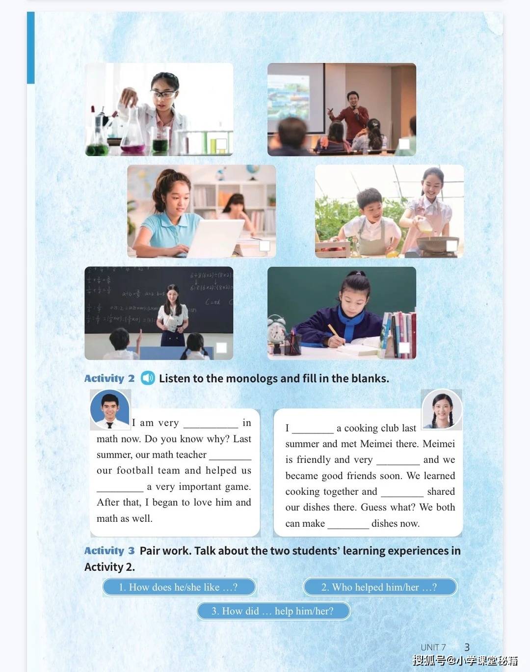 教材以 “准备 — 探索 — 拓展 — 收篇” 的板块结构推进学习。在 “准备” 板块,通过听说活动、功能句型和语音训练引入单元主题,比如 Unit 7《Be a Better Learner!》就从 “学习活动” 的听力任务切入,引导学生掌握记笔记、做实验等表达,同时练习语调、连读等语音规则。