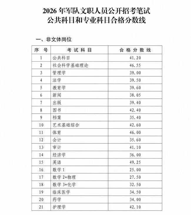 2026年军队文职人员公开招考笔试公共科目和专业科目分数线 ·
