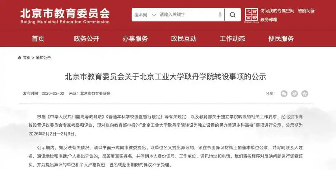 根据北京市教委的公示信息,北工大耿丹学院即将转设,将转设为独立设置的民办普通高校。不过,教委的公示中,未明确学校转设后的新校名,可能目前能确定的只有转设这件事,而校名,还在考虑或者在博弈中。