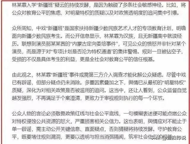 林傲霏作为北京考生被中戏录取,本身似乎也没特别。明星子女高考风波也不是第一次,但闫学晶曾这样说,“分数低,报了新疆班”,公众就对录取合规性发出疑问,很多人开始寻找蛛丝马迹。