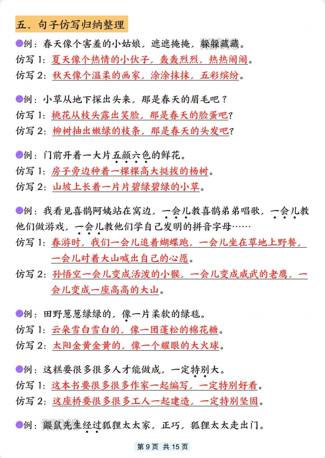 这份 26 春二年级下册语文全册重点知识归纳,直接把整册教材的核心内容打包成 **“日积月累 + 古诗 + 字词 + 仿写 + 分类积累” 的全能启蒙包 **:从 “助人名言、十二生肖” 的文化积累,到《咏柳》《村居》的古诗背诵,再到 “多音字、形近字” 的字词夯实,连 “句子仿写、近义词反义词” 都安排得明明白白,还配了 “分类词语、职业名称” 等拓展内容,简直是二年级语文冲刺的 “神器”!