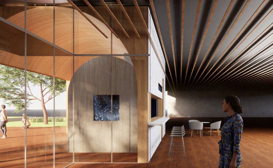 图为正在施工的上海工程技术大学仙霞路校区咖啡馆设计图。