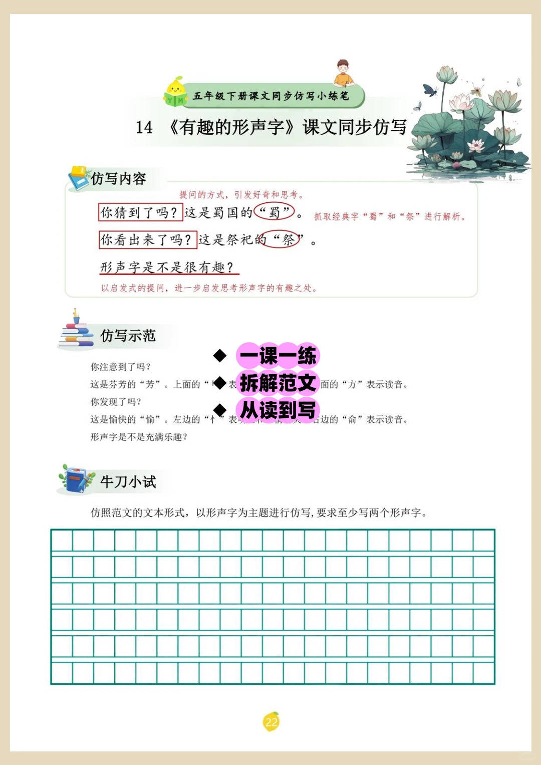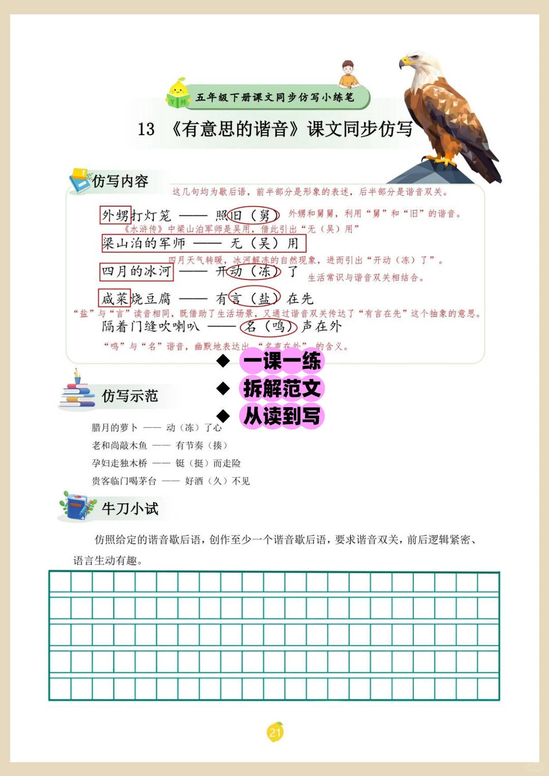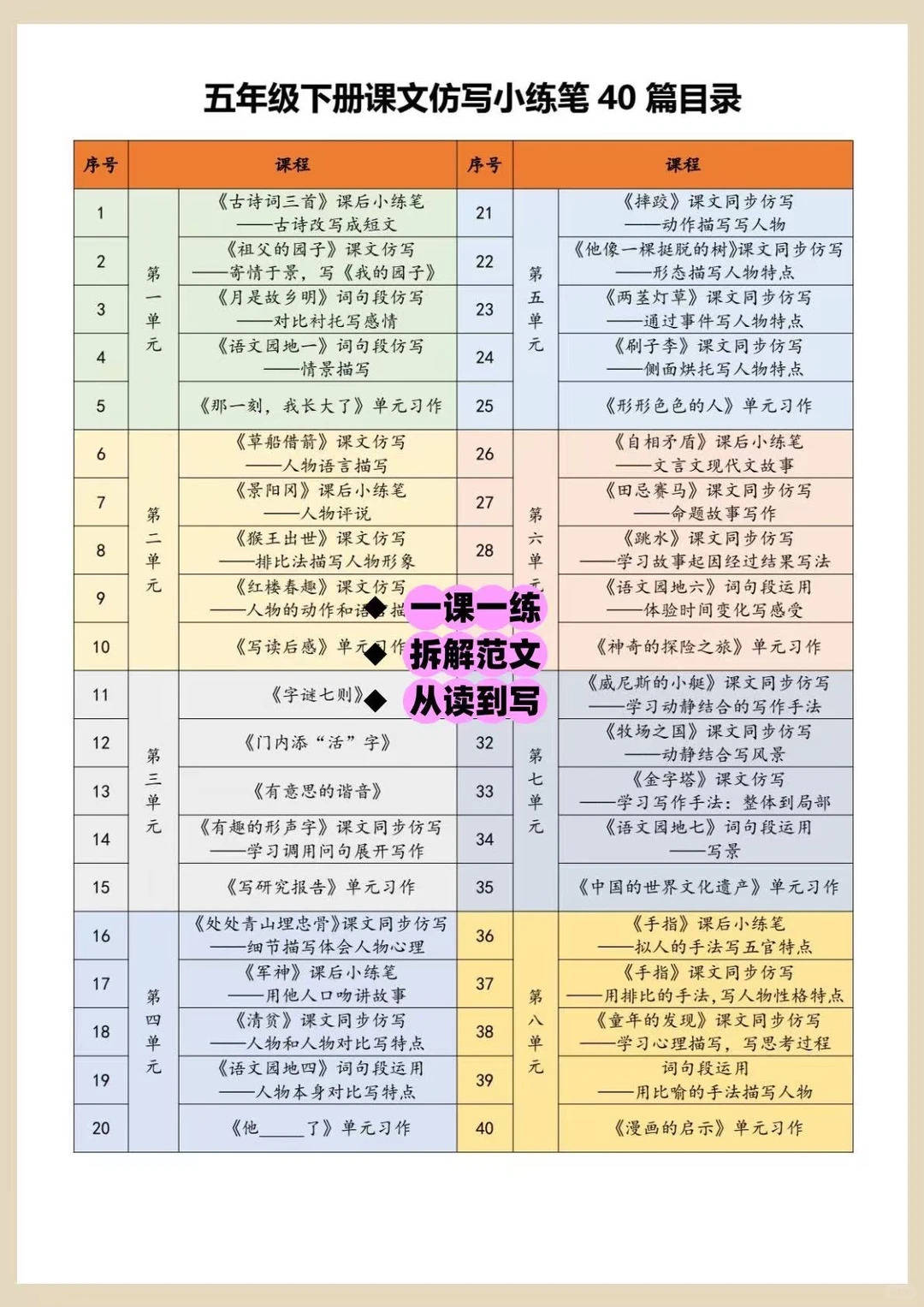 这份资料是五年级下册语文同步仿写小练笔,覆盖全册 40 篇重点课文与单元习作,每篇都包含仿写内容拆解、范文示范、牛刀小试三大模块,把课文里的人物描写、场景表达、叙事结构、思维逻辑等核心写作技巧拆解成可直接模仿的模板,是五年级孩子从 “完整叙事” 向 “生动表达” 进阶的关键素材!