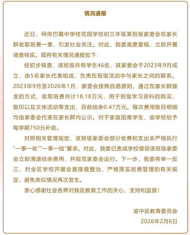近日,网传巴蜀中学桂花园学校初三年级某班级家委会在家长群收取班费一事,引发社会关注。对此,我委高度重视,立即开展调查核实。现将有关情况通报如下:
