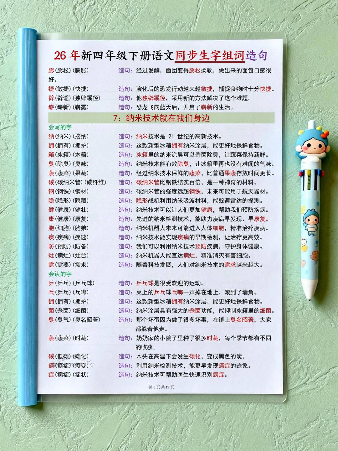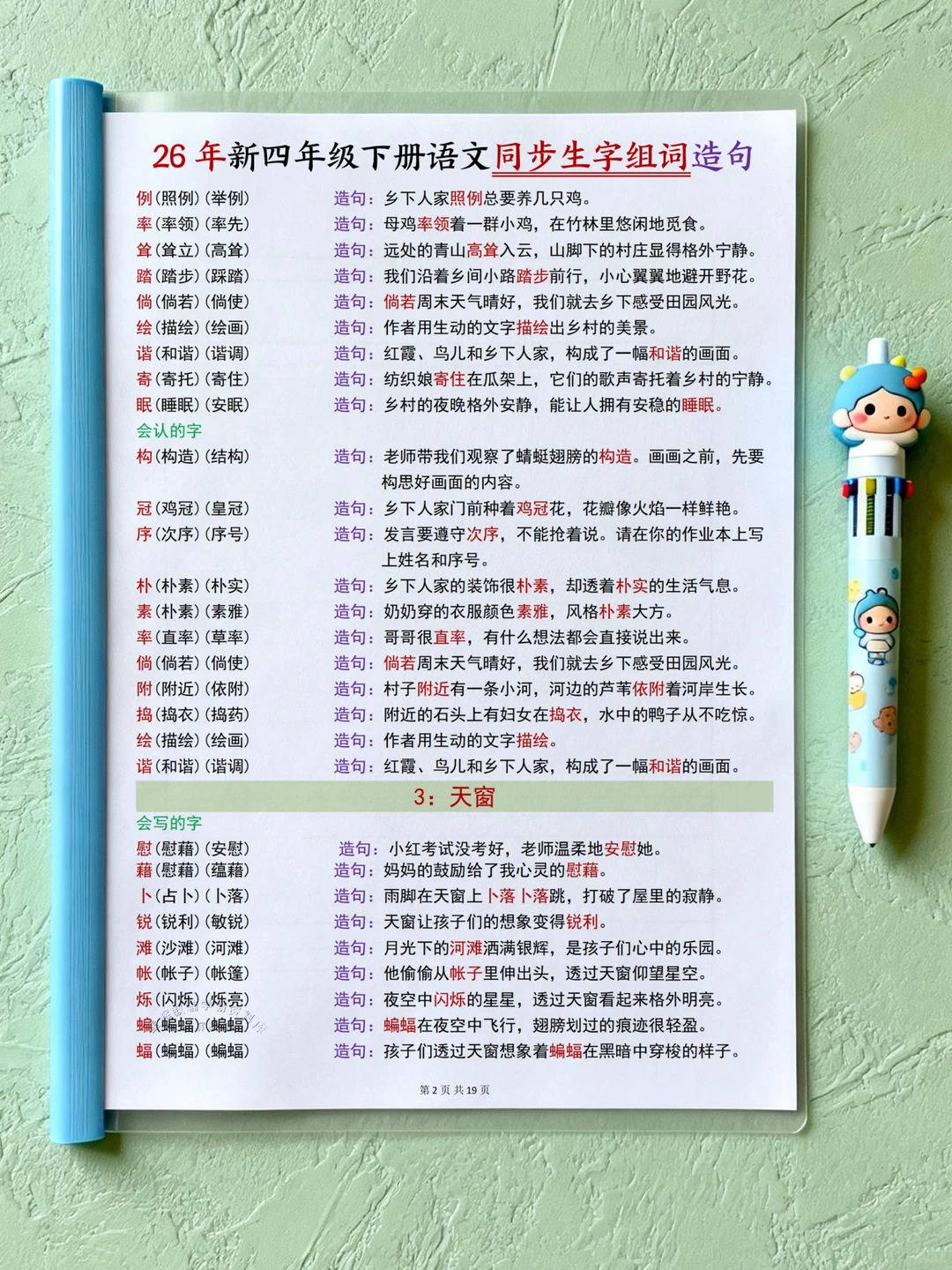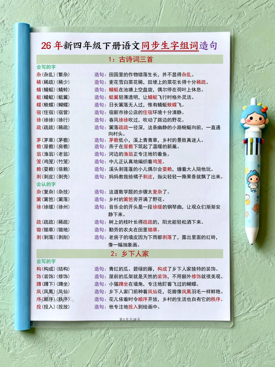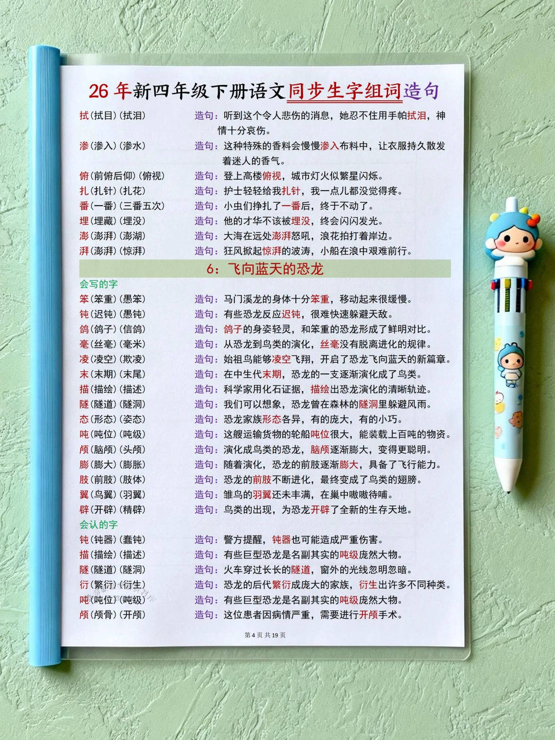 26春新版四年级下册语文同步生字组词造句资料来啦。 共19页,严格对标部编版教材,按28篇课文顺序梳理核心生字。 覆盖“会写”与“会认”字,每个生字搭配2 - 3个常用或拓展词, 兼顾重点与积累。造句贴合四年级学情,结合语境与生活,句式丰富。 多种文体生字都有,条理清晰,助孩子巩固字词,积累词汇句式, 日常学习复习超实用。
