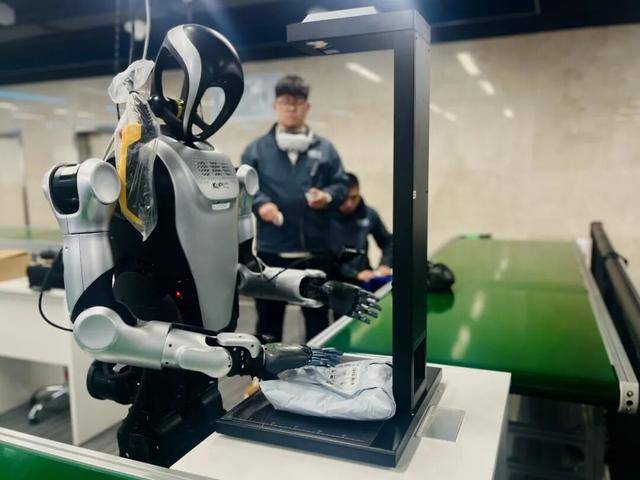 在青岛市人形机器人数据采集训练场,人形机器人正在学习分拣快递。