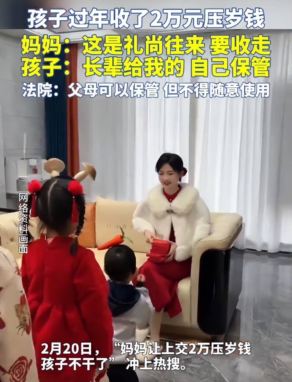 前两天有一个孩子自己压岁钱收了2万块钱,妈妈让他把红包上交,并美其名曰这是礼尚往来。
