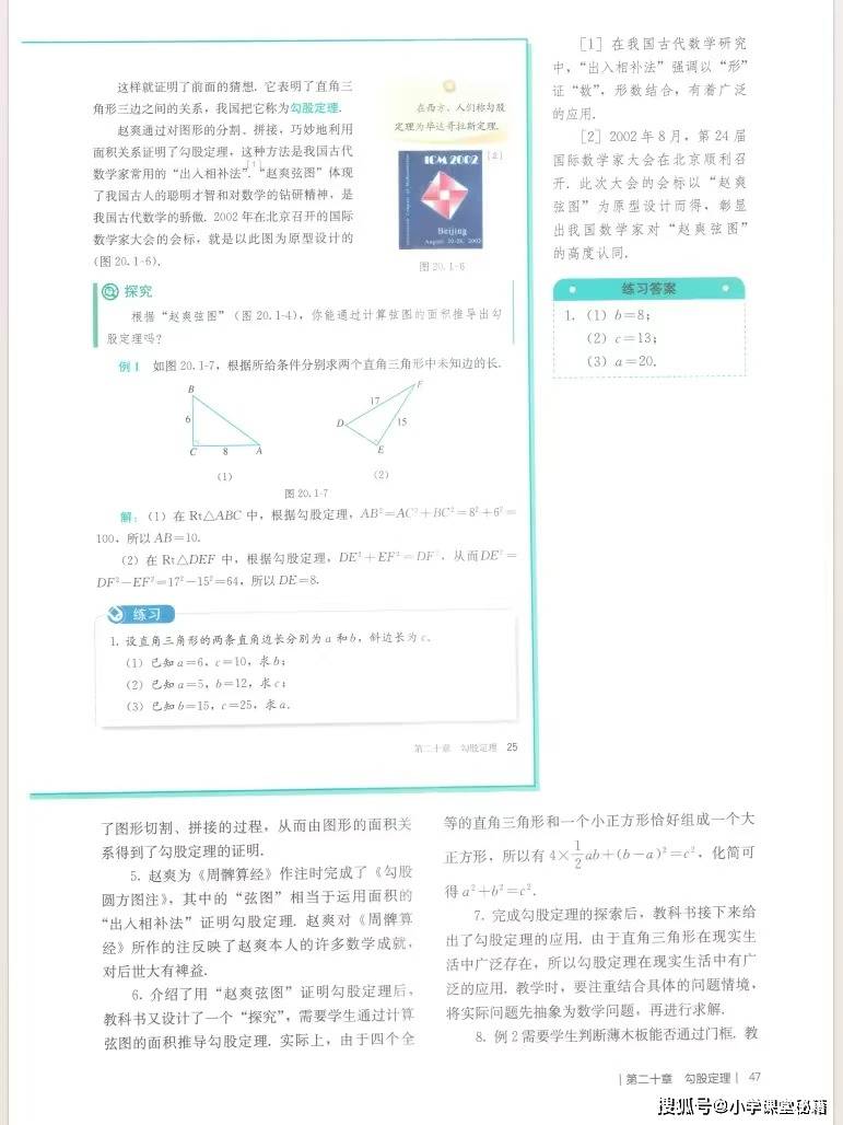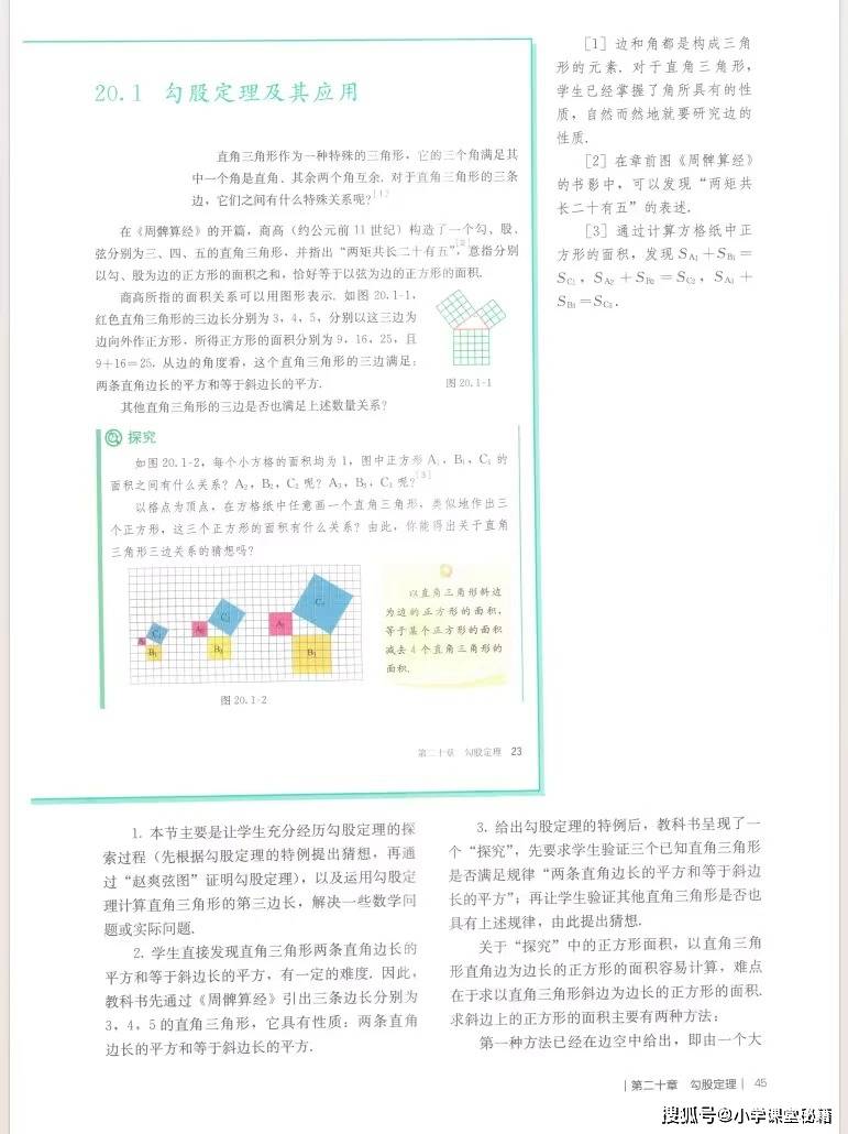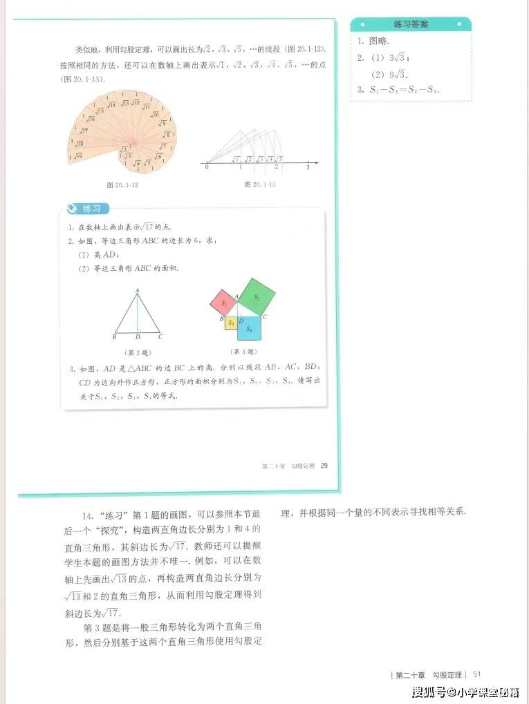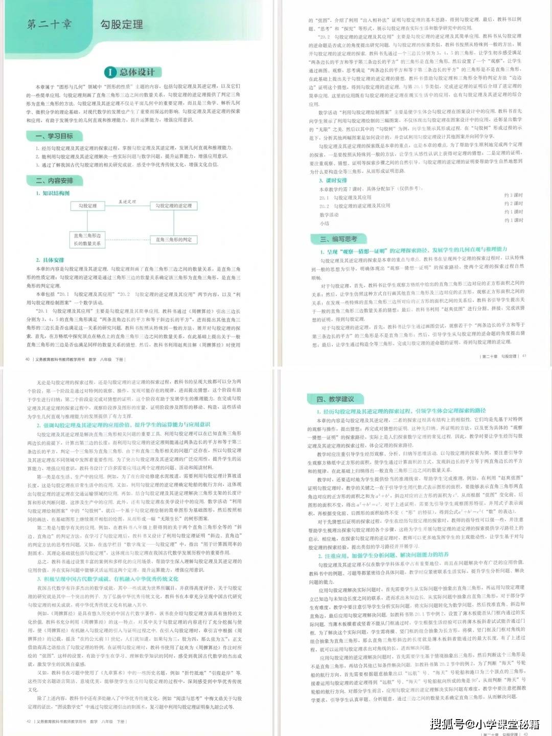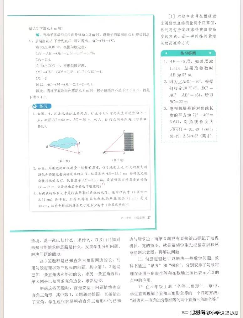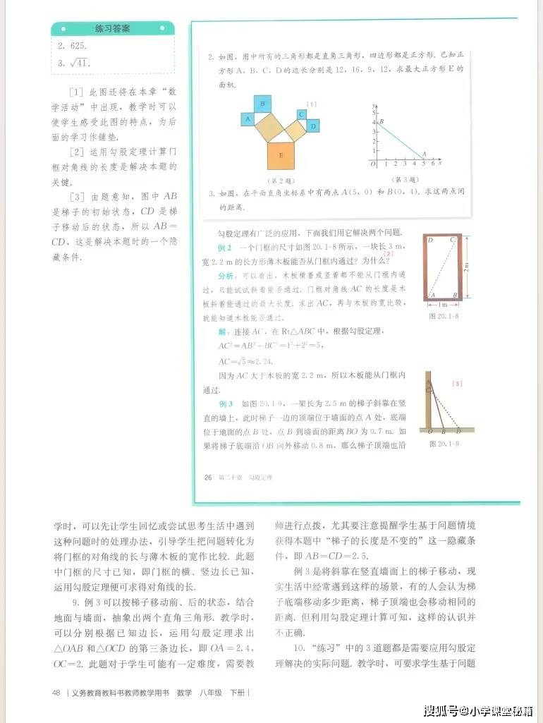 对教师而言,这本教参的核心价值在于提供了可落地的教学支架。它不仅明确了每章的学习目标、重难点,还以《勾股定理》为例,给出了完整的知识框架图和任务设计表,将 “探究弦图面积推导定理”“解决木板过门、梯子滑动等实际问题” 等探究活动细化到课时,降低了教学实施难度。教参配套的课时分配建议、习题参考答案和拓展资源,也帮助教师合理规划教学节奏,兼顾知识传授与核心素养培养。