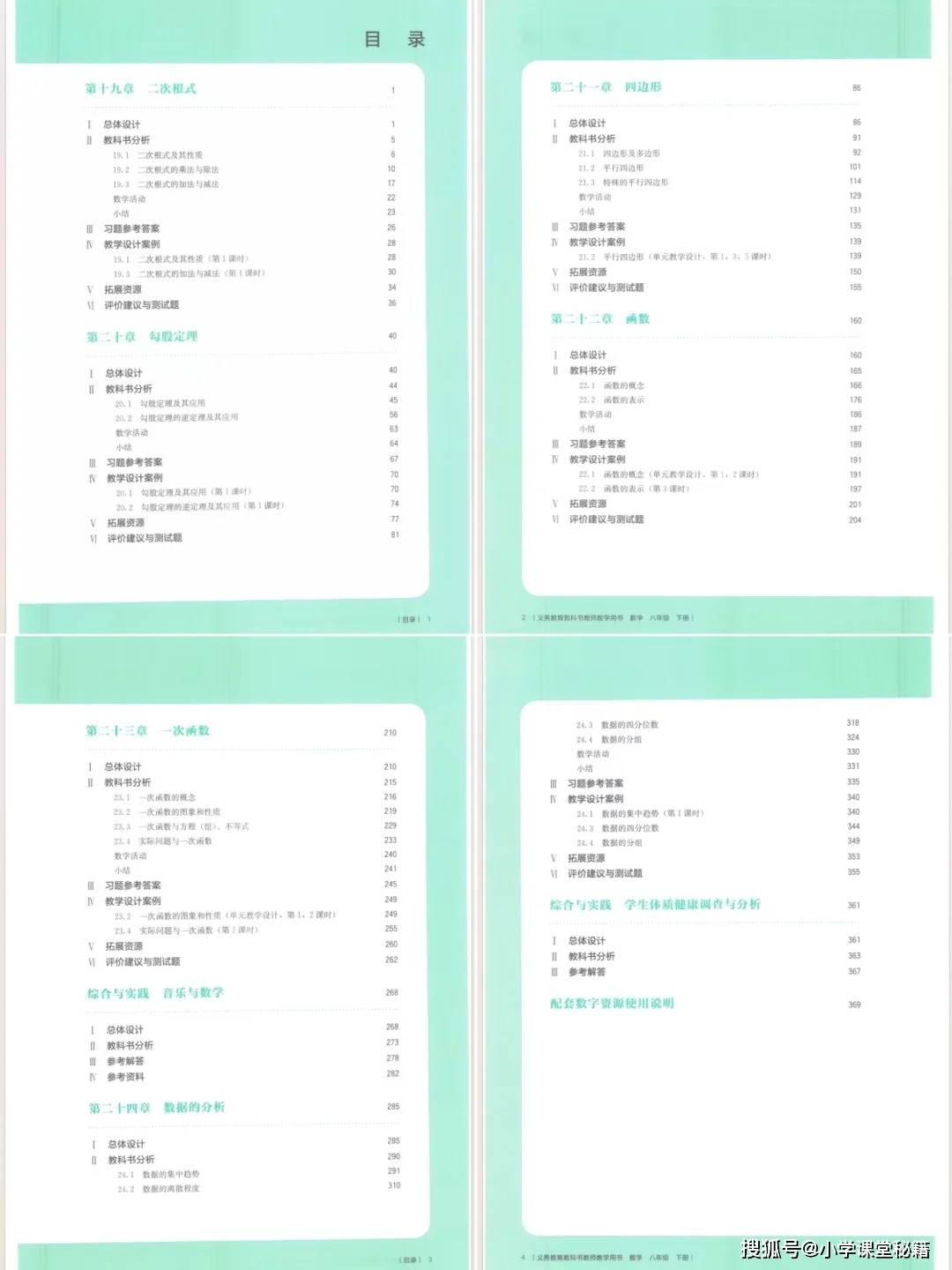 本册教参围绕六大核心单元展开,形成 “代数 — 几何 — 函数 — 统计” 的进阶学习路径:二次根式聚焦根式的性质与运算,为后续学习奠定基础;勾股定理通过 “赵爽弦图” 等经典证明,渗透数形结合思想与中华优秀传统文化;四边形从平行四边形到特殊四边形,引导学生构建几何图形的性质与判定体系;一次函数则是学生首次系统接触函数概念,是衔接初中与高中数学的重要桥梁;数据的分析则培养学生的统计思维与数据分析能力。此外,教参还设计了 “音乐与数学”“学生体质健康调查与分析” 等综合实践活动,让数学学习更贴近生活。