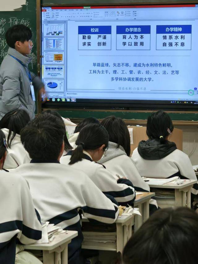宣讲现场,团队成员有序走进高三教室,在黑板旁的电子屏上播放起“华北水利水电大学招生简介”PPT。付旭同学站在屏幕前,用清晰的语言系统梳理了华水自1951年建校以来的发展脉络、办学定位与育人理念,屏幕上“勤奋、严谨、求实、创新”的校训,“育人为本、学以致用”的办学理念,以及“情系水利、自强不息”的办学精神,让在场学子对学校的综合实力有了整体认知。
