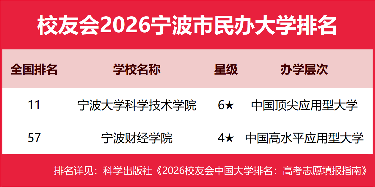 校友会2026宁波市民办大学排名,宁波大学科学技术学院第一,宁波财经学院前三