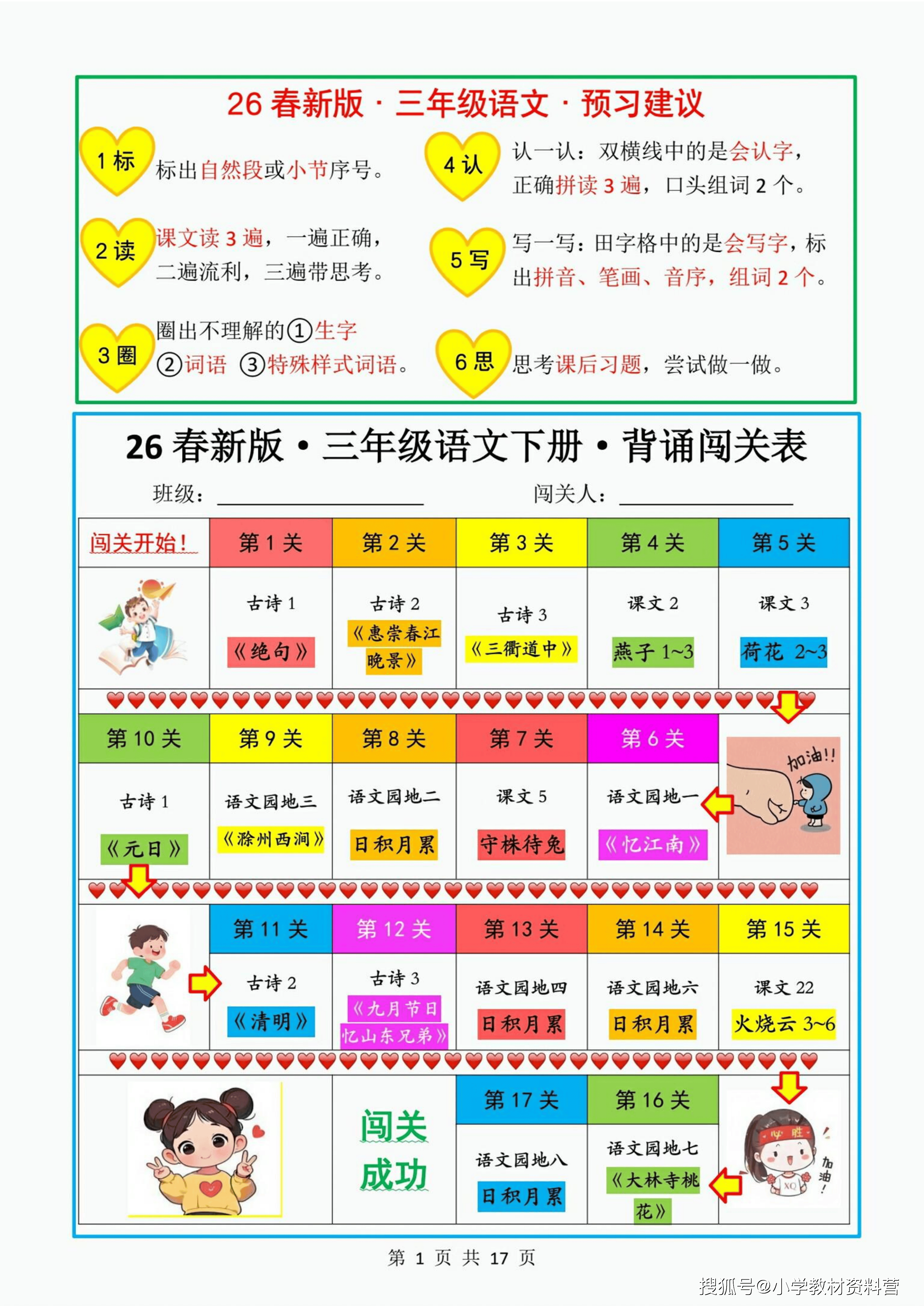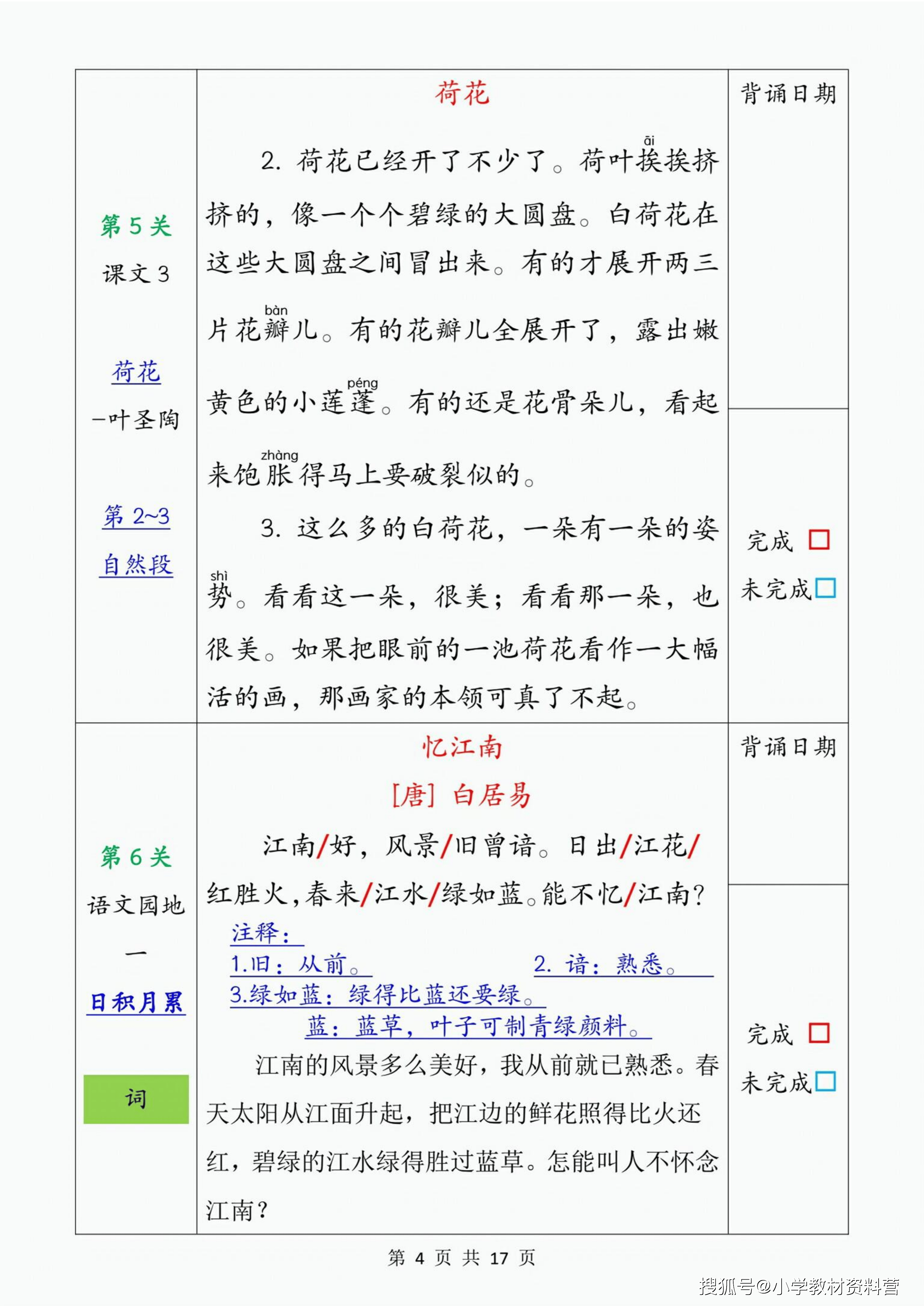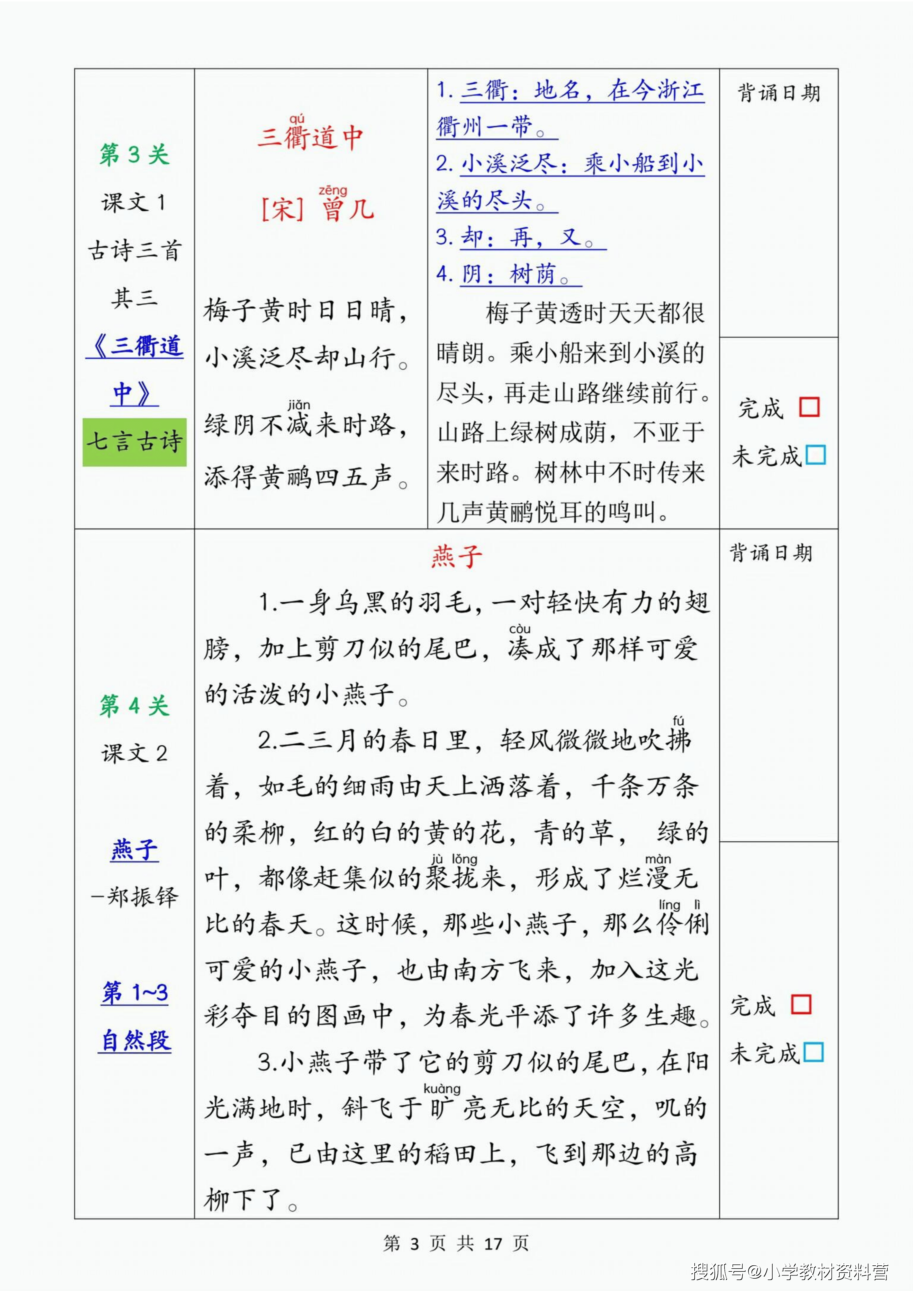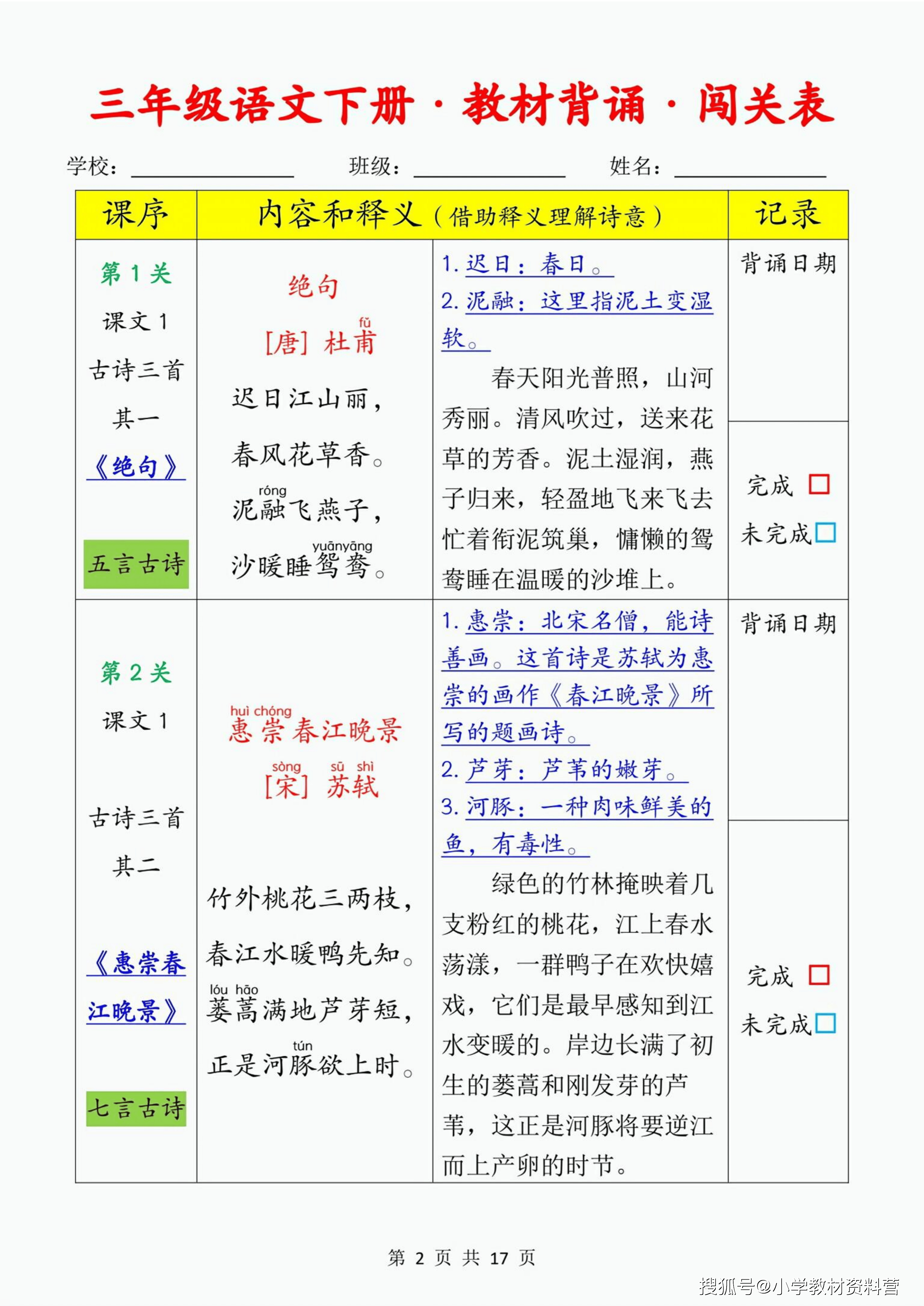 当预习的基石筑牢,背诵闯关便成了检验与巩固的精彩舞台。这份背诵闯关表,将本学期的核心内容巧妙地拆解为 17 个趣味关卡。从杜甫的《绝句》到苏轼的《惠崇春江晚景》,从《燕子》的灵动文字到《荷花》的优美篇章,再到《忆江南》的千古绝唱,每一关都承载着经典的重量与语言的魅力。