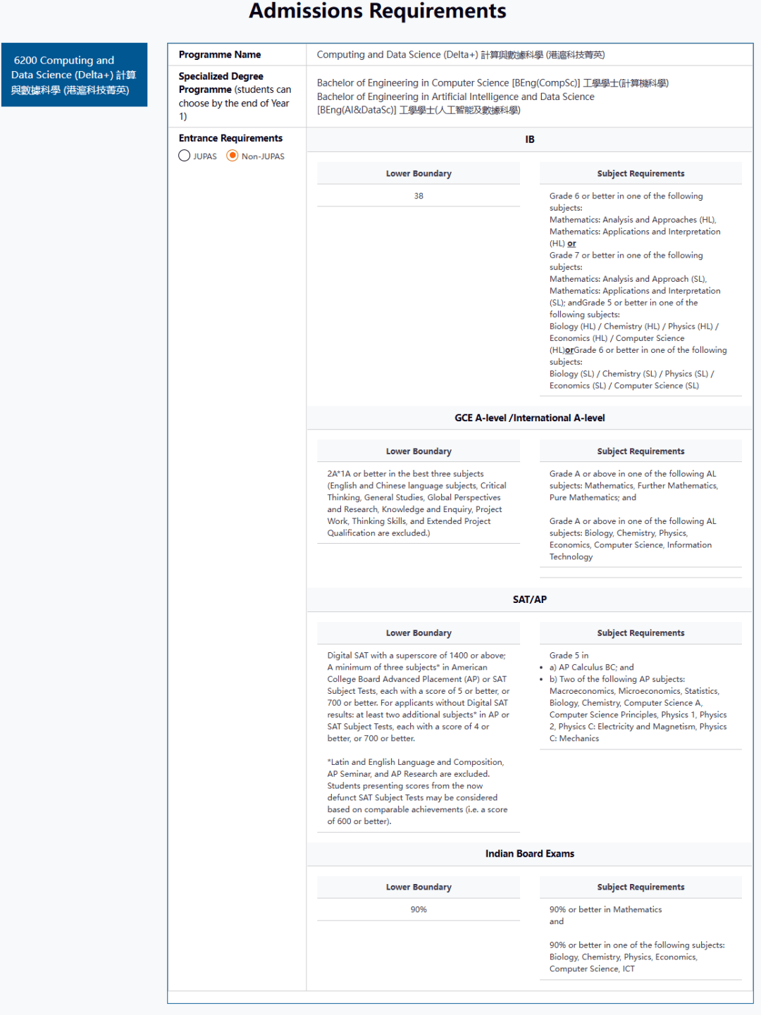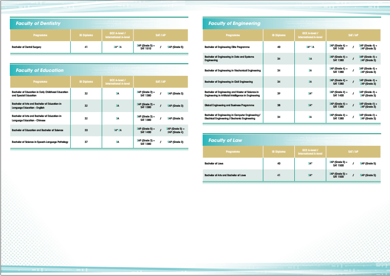 入学最低要求:2A*1A(不包括中文、英文、批判性思维、通识教育、全球视野与研究、知识与探究、项目工作、思维技巧和扩展项目资格)。