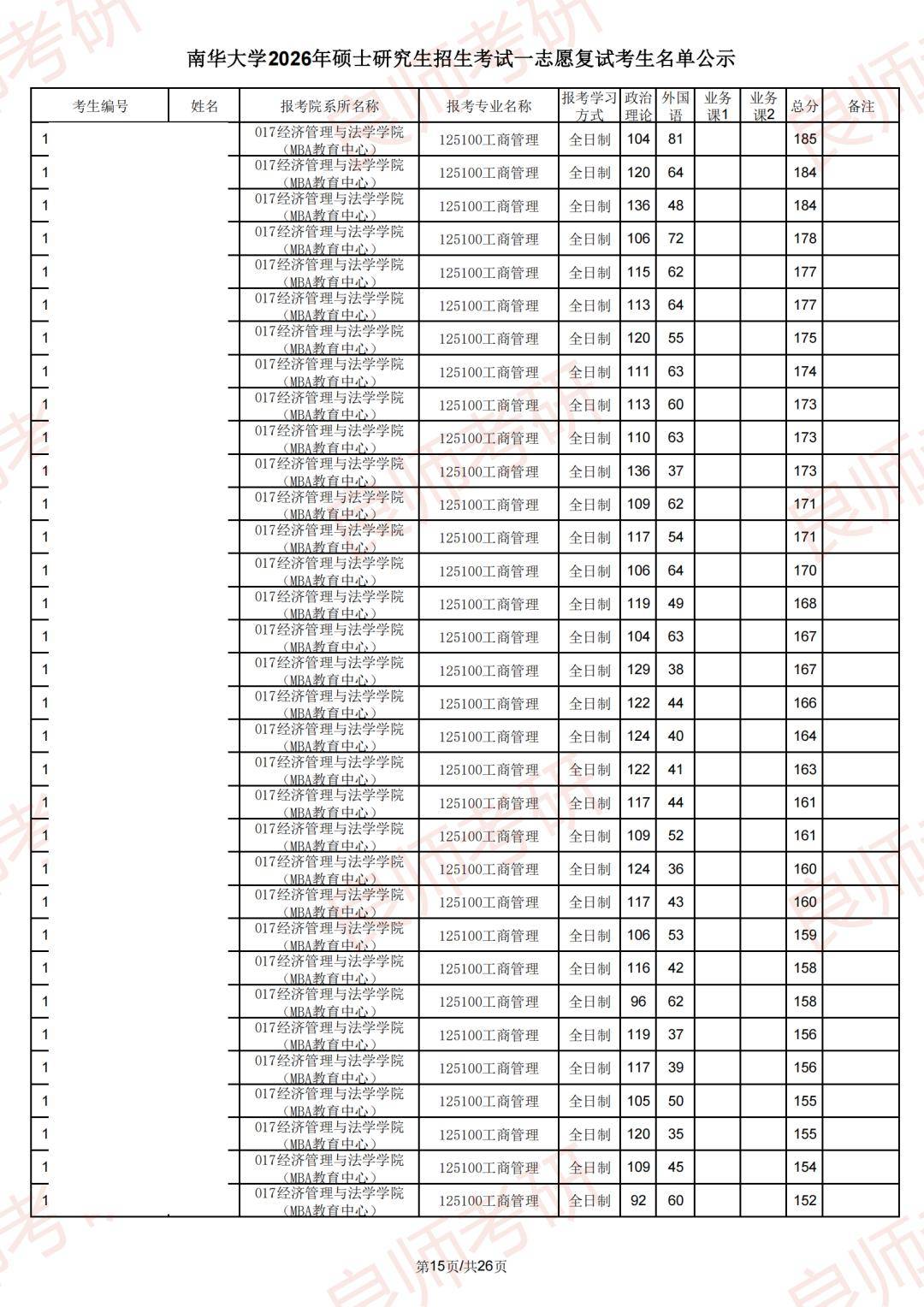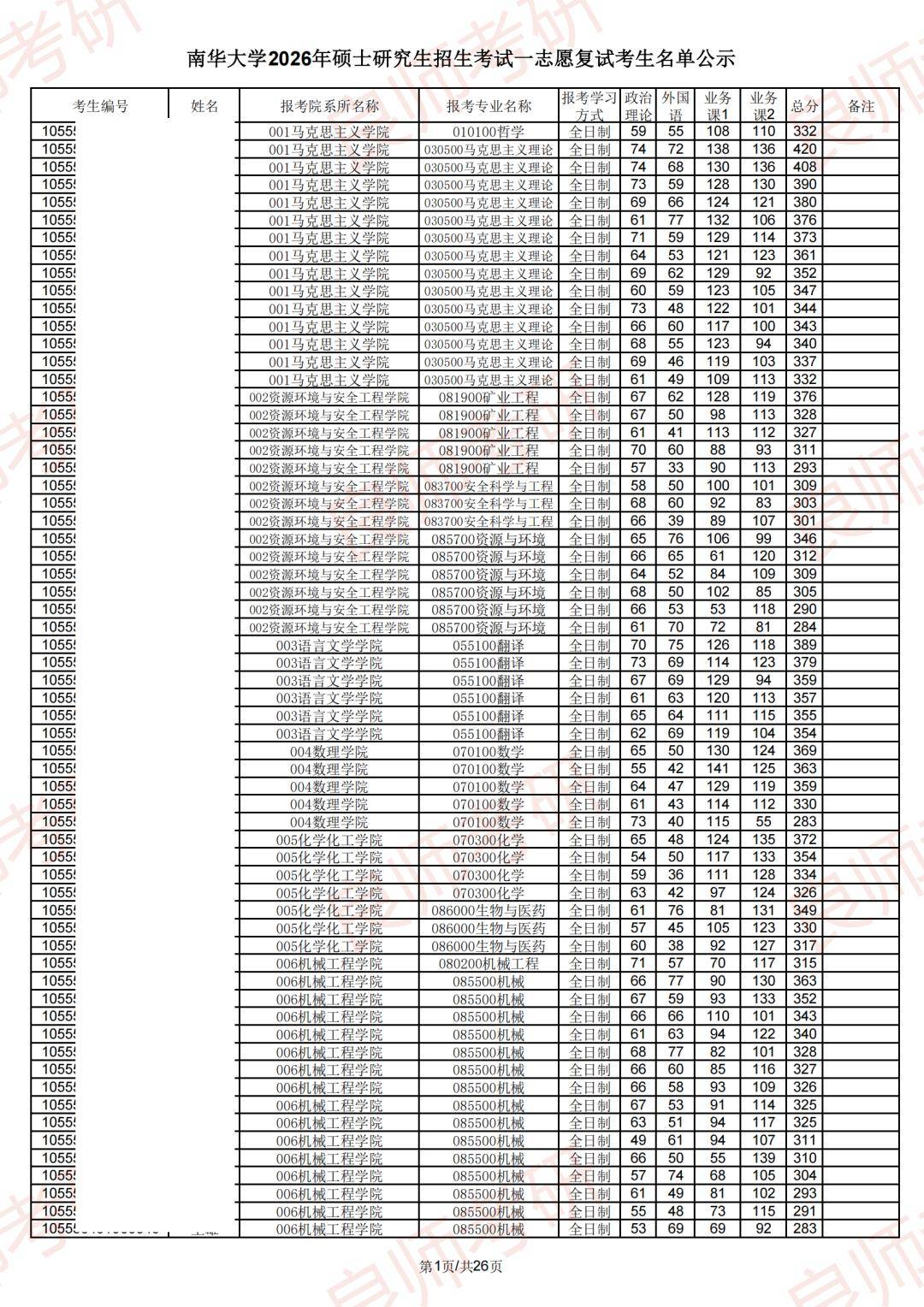 南华大学一志愿复试名单(部分)
