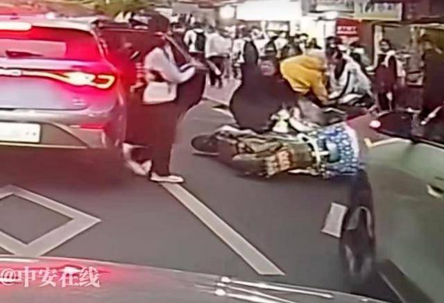 一位家长开车送孩子上学,孩子匆忙下车时,没留意旁边的电动车,不小心撞倒了一对同样送孩子上学的母女。