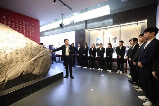 在唐鸿胪井刻石馆的“行走的思政课”环节,金洪培向同学们介绍,这块镌刻着29个汉字的刻石,是唐朝遣使崔 (忻)册封渤海国、宣示主权的铁证。这份关键凭证成为我国追讨丢失国宝的最有力证据,也凸显了我校在唐鸿胪井刻石研究与文物追讨领域的独特地位和重要贡献。