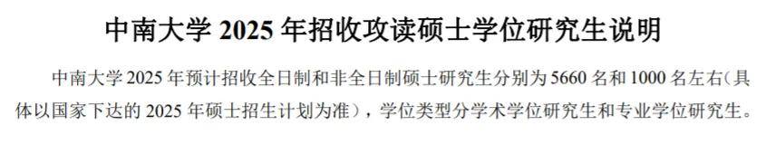中南大学2025年预计招收硕士研究生6600左右名,2024年招收硕士研究生6100名左右,扩招500名。