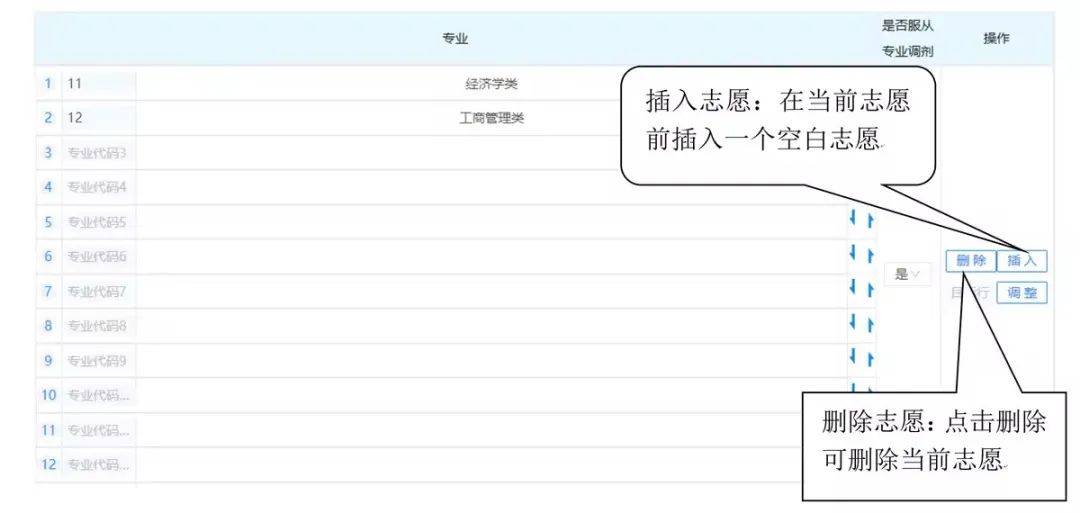 ● 在目标行框内输入序号(1-45号),点击调整,即可将当前志愿调整到目标志愿序号。还可以通过鼠标拖拽的方式,将当前志愿拖拽到目标位置,目标志愿序号的后续志愿序号依次加一。