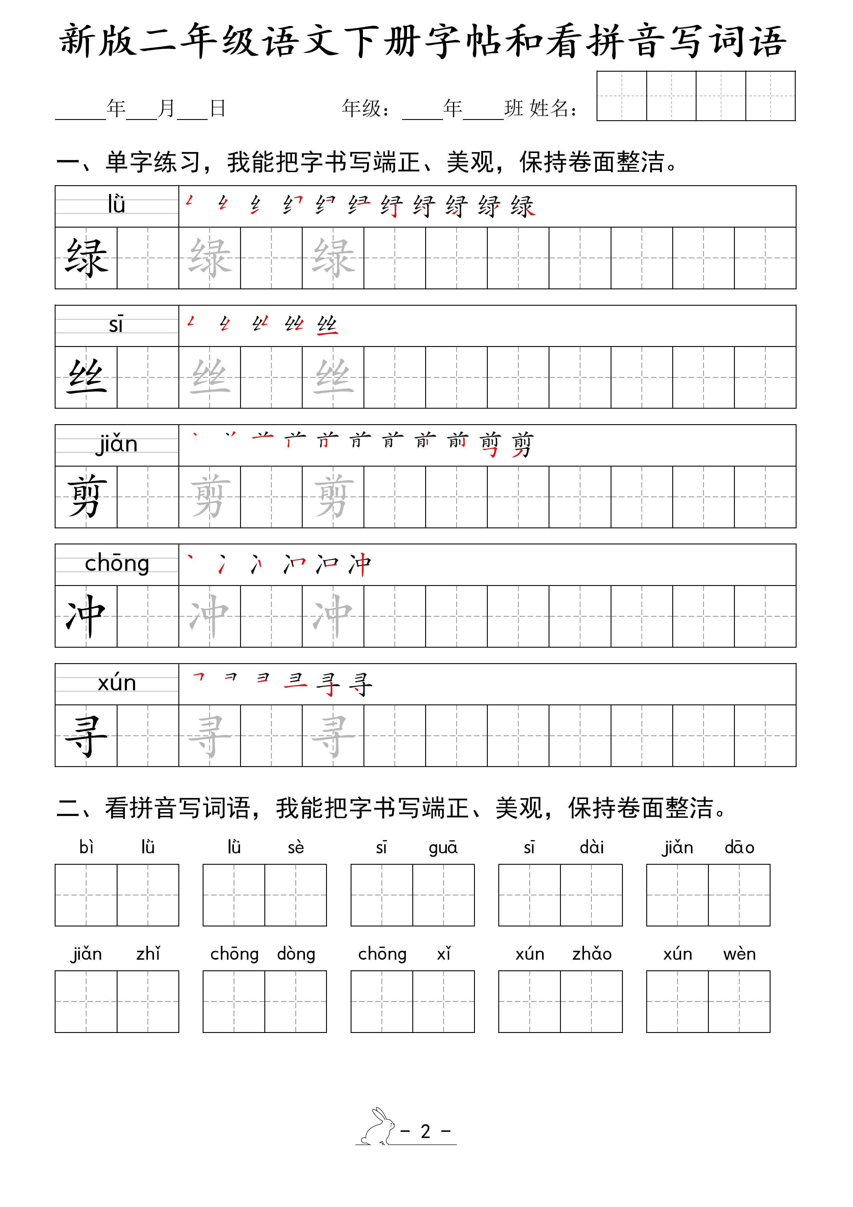 今天为大家分享:新版二下语文字帖和看拼音写词语(50页)。小学二年级是语文学习的重要阶段,汉字作为语文学习的基石,其学习成效直接影响着学生后续的语文能力发展。一份优质且贴合教学内容的学习材料,对于二年级学生扎实掌握汉字知识至关重要。这里所呈现的二年级语文下册字帖和看拼音写词语的学习内容,从多个维度为学生的汉字学习提供了系统且实用的支持。