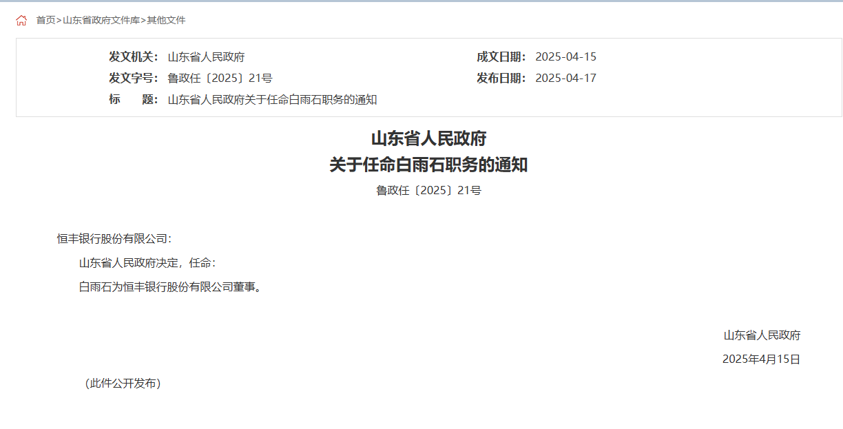 山东省人民政府官网4月17日发布关于任命白雨石职务的通知:山东省人民政府决定,任命白雨石为恒丰银行股份有限公司董事。