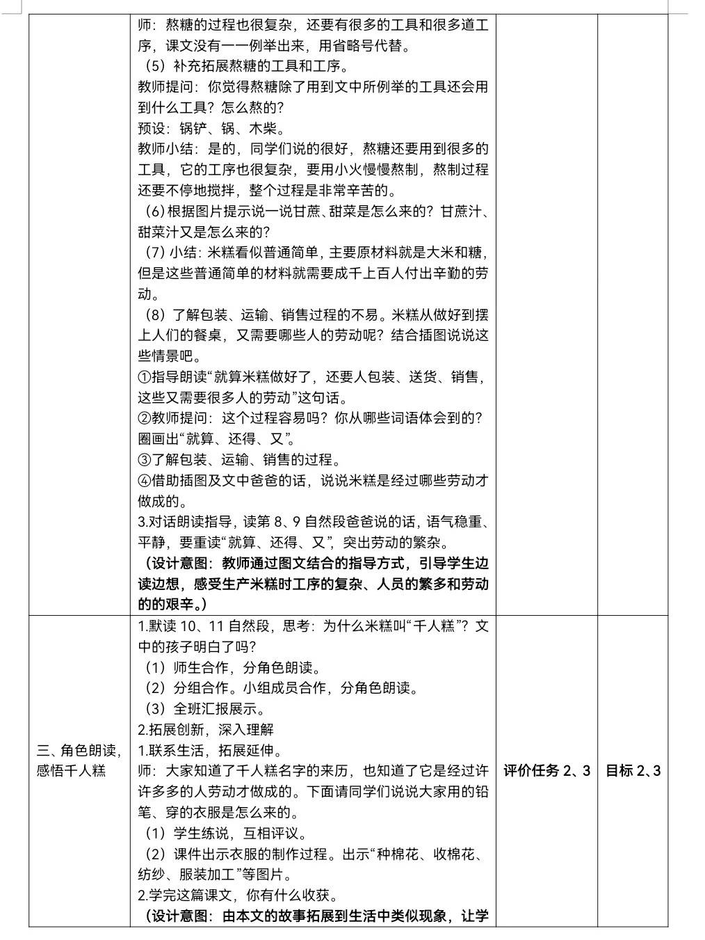系统的教学目标和环节设计,能引导学生逐步掌握生字词,提升朗读和阅读理解能力。通过对千人糕制作过程的探究,学生能深刻理解劳动成果的来之不易,培养珍惜粮食和他人劳动成果的意识。评价任务的设置有助于学生及时了解自己的学习情况,教师也能据此调整教学策略。整体而言,这份教学设计为学生提供了清晰的学习路径,助力学生在语文知识学习和品德培养上取得进步。