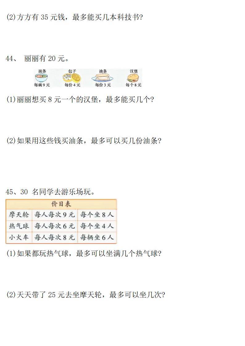 今天为大家分享:二年级下册数学《有余数的除法》九大考点专项(含答案)涵盖了物品分配、资源使用等多种场景,如学校分发物品、食堂消耗食材等,让学生通过具体例子理解平均分后余数的产生。对于最少 “拿走” 或 “添加” 的问题,明确了拿走余数、添加 “除数 - 余数” 可使分配更加平均的规则,并通过故事书分配、物品装盒等实例进行说明。此外,还有涉及购买物品数量计算、游乐项目参与次数计算以及周期循环问题等,如根据价格和金额计算可购买商品数量、依据活动价格表计算可参与次数,以及根据彩旗排列、气球布置、队伍排列等场景计算特定元素的数量或位置等。