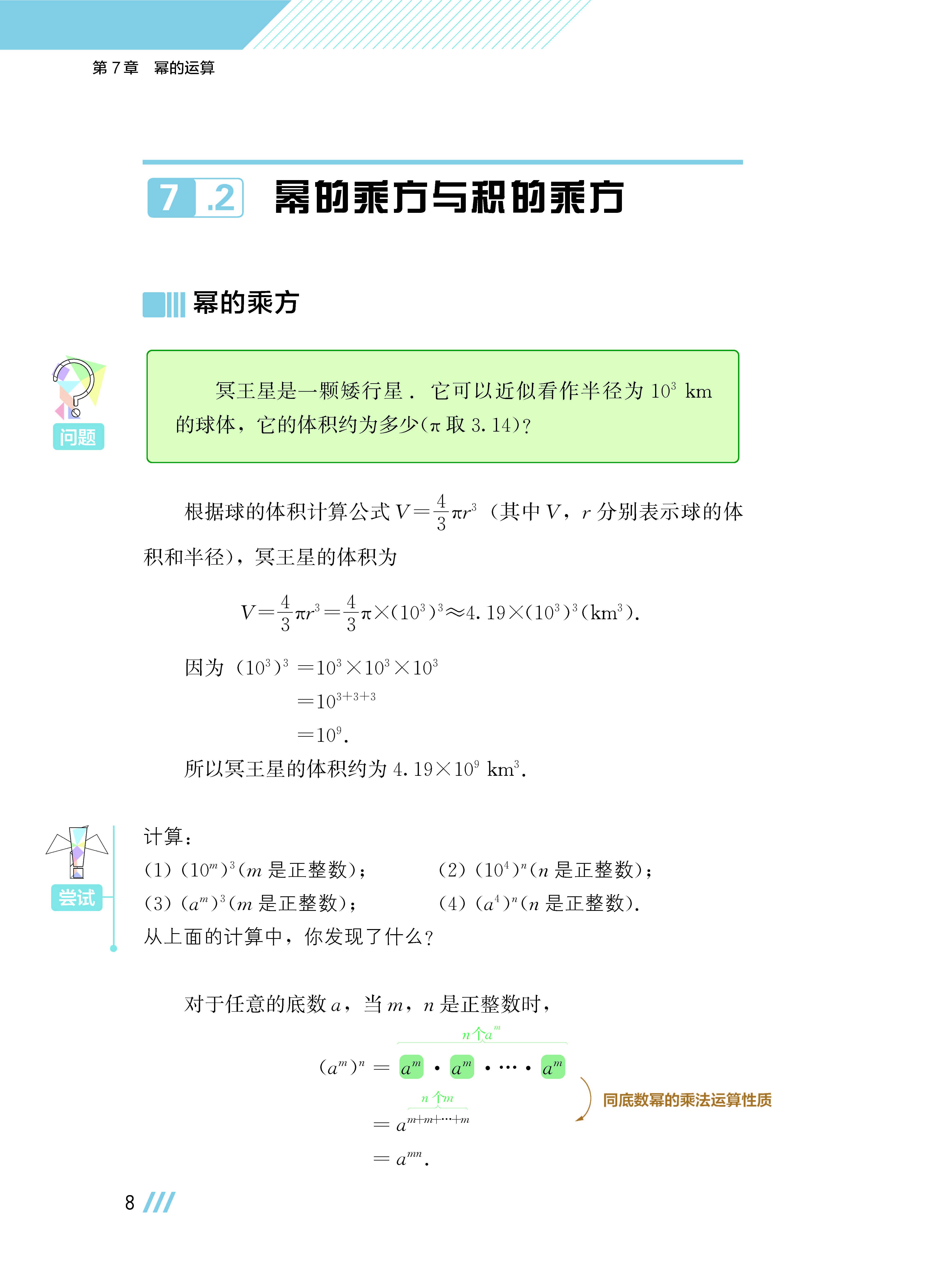 1. **第7章 幂的运算**:包括同底数幂的乘法、幂的乘方与积的乘方、同底数幂的除法,让学生了解幂的运算性质,掌握整数指数幂的运算。