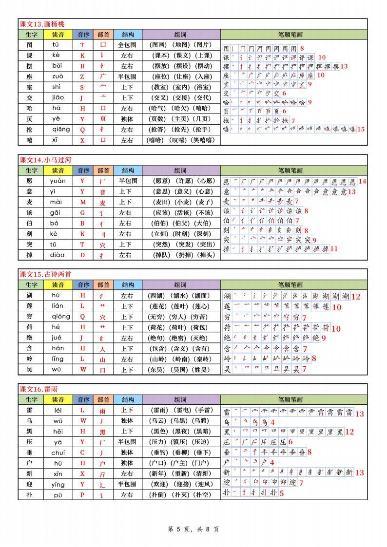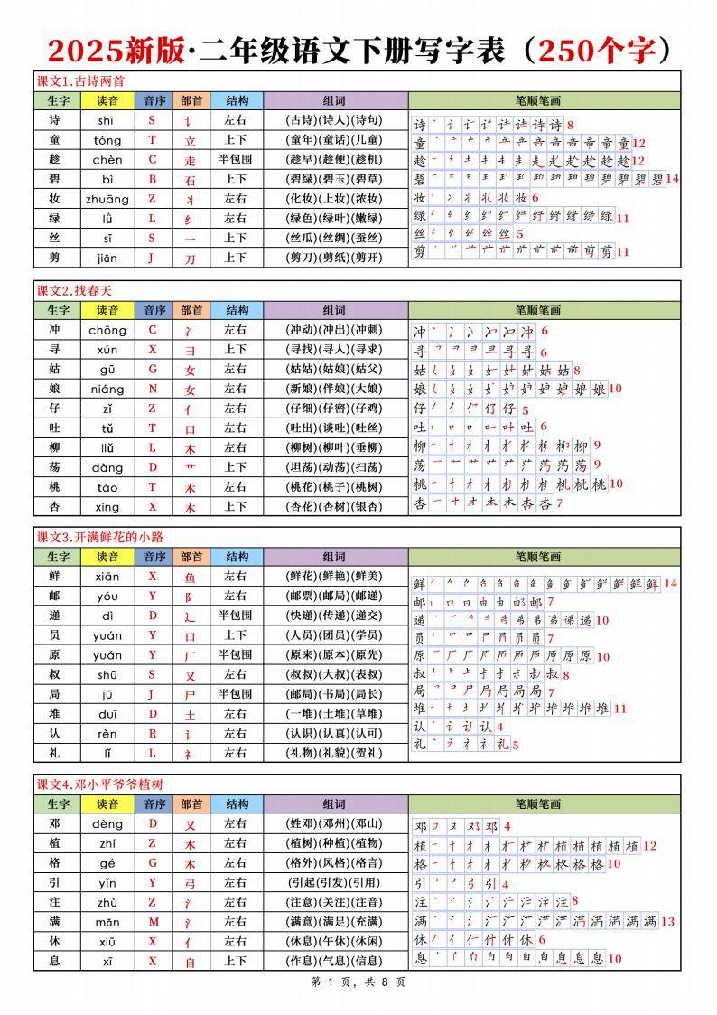 这是一份 2025 新版二年级语文下册写字表资料,共 8 页,涵盖了二年级下册语文教材中的 250 个生字。针对每个生字,资料详细列出了读音、音序、部首、结构、组词以及笔顺笔画等信息。从课文《古诗二首》中的 “诗、童、碧” 等到《羿射九日》里的 “觉、值、类” 等,全面覆盖了教材中的生字内容。通过规范的呈现方式,为二年级学生学习汉字提供了系统且细致的指导。