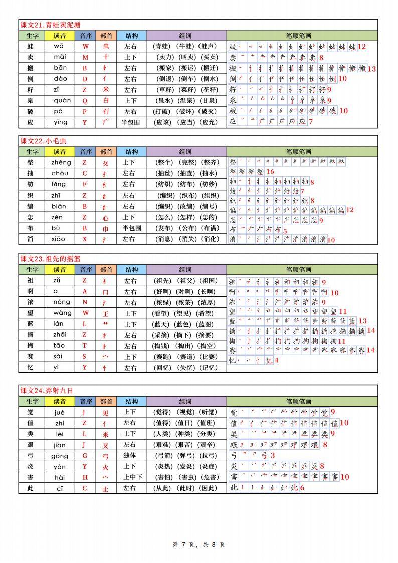 正确笔顺引导:详细的笔顺笔画展示,为学生提供了正确的书写示范。二年级学生正处于书写习惯养成的关键时期,按照资料中的笔顺书写,如 “植” 的笔顺为 “横、竖、撇、点、横、竖、竖、横折、横、横、横、横”,能够避免笔画错误和倒笔字,养成规范书写的习惯。