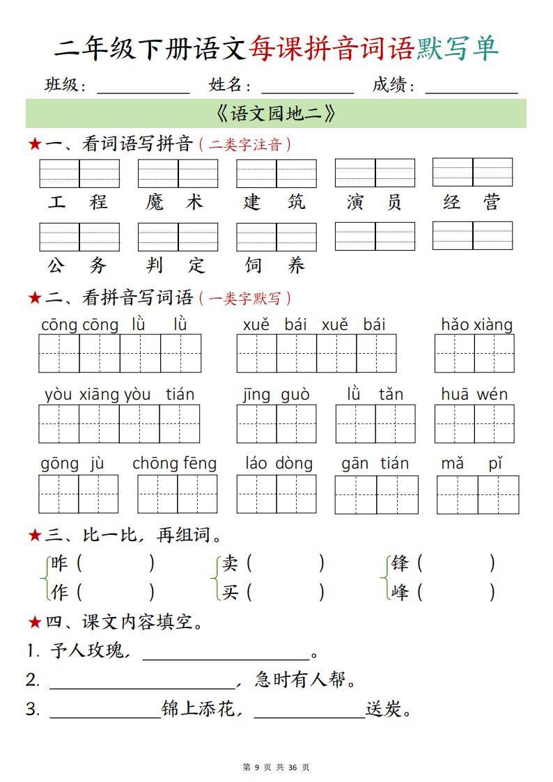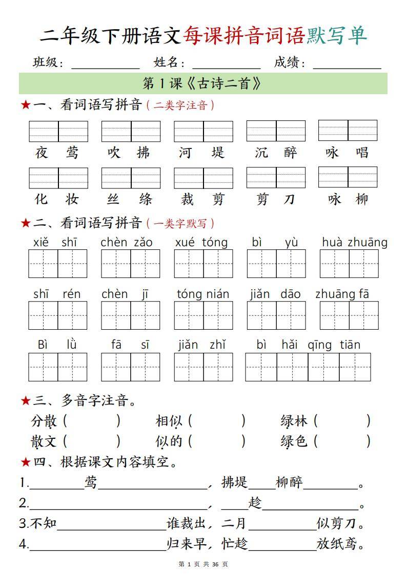 今天为大家分享:二年级下册语文每课拼音词语默写单,针对每课内容,设置了看词语写拼音(二类字注音)、看拼音写词语(一类字默写)、多音字注音、根据课文内容填空等题型。从开篇的《古诗二首》到《语文园地二》等,全面考查学生对课本中生字词的读音、写法以及对课文内容的熟悉程度。