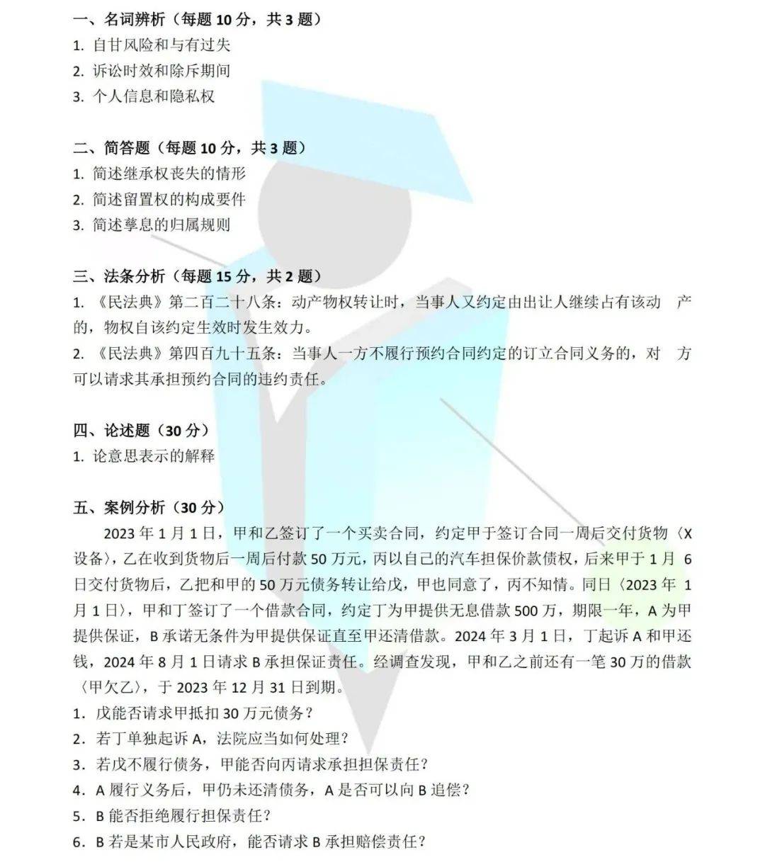 了解考试形式和考试难度: 通过历年真题可掌握题型分布(如论述、简答、案例分析)及高频考点,可以更好地了解各类考试题型,以及不同题型的考察重点和答题技巧,从而更好地应对考试。例如经济法的“适度干预原则”、商法的“独立董事制度”等多次出现在中南财大考题中。如宪法学的“宪法监督制度”“人民代表大会制度”、经济法学的“反垄断法”“增值税改革”等,均是中南财大命题重点等