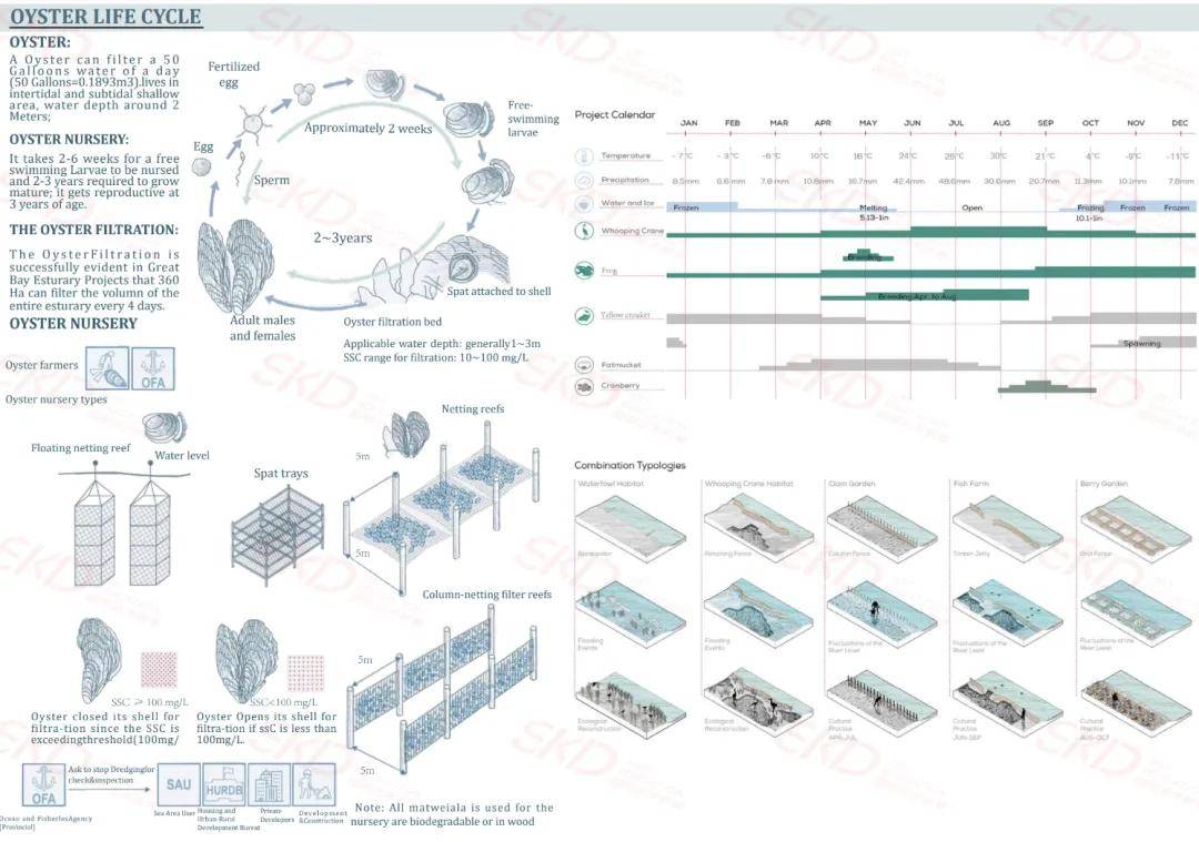 我了解到牡蛎这个生物居然可以每周过滤整个海湾的水体的水质, 利用牡蛎礁提供一个生态循环体系减少海浪侵蚀冲击。同时他也有被称为:生态系统工程师,调整农业类型种植更适合盐碱种植的植物,最终形成了这个作品。