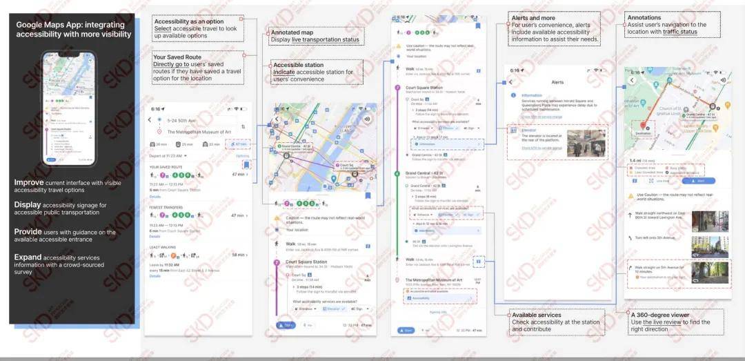 最后拟定以google maps为基础增加无障碍通行的功能, 以无障碍公共交通、距离和换乘次数为衡量标准规划路线,并加入了一些其他无障碍相关标识,收集信息的过程中, 我花费了大量时间了解各种地图,比如地图类app,游客用的印刷地图,导览图,sensory map, 场馆自制的周边地区图,interactive map等。
