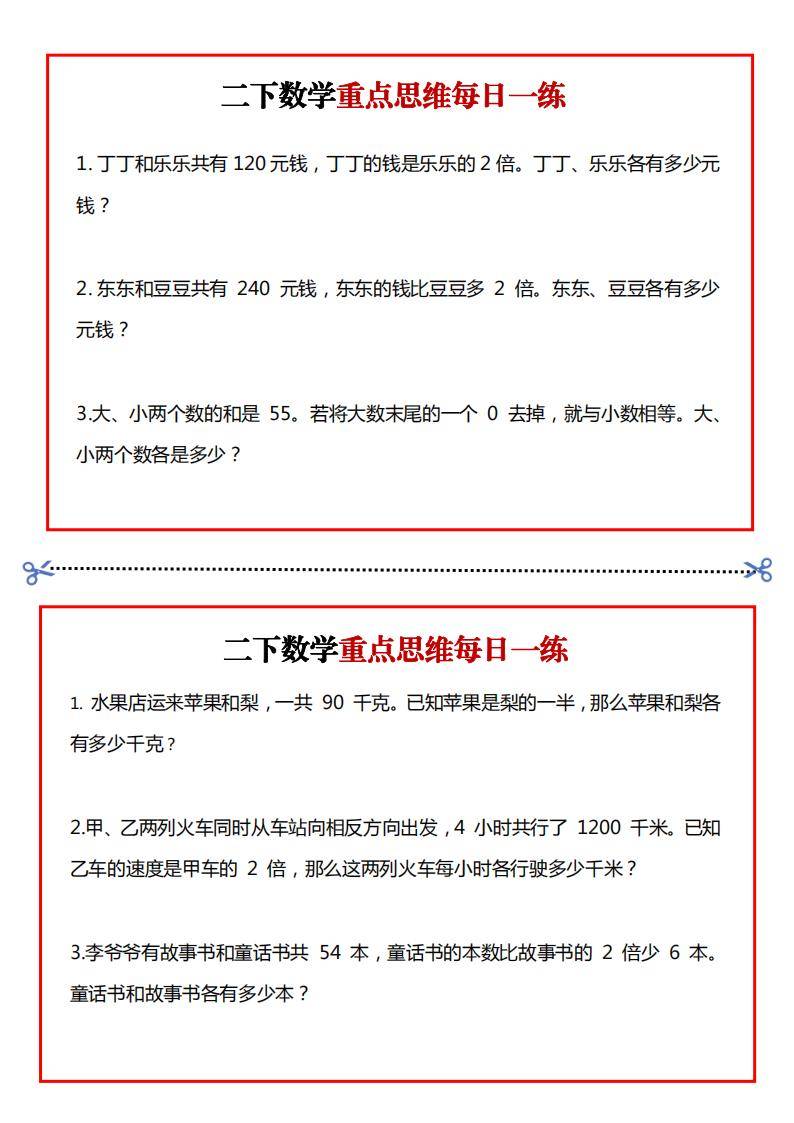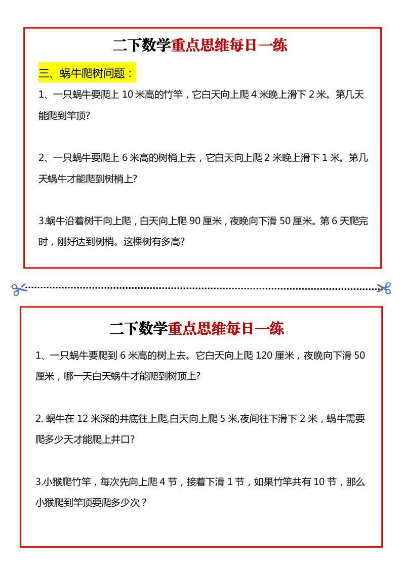 这是一套二年级下册数学重点思维每日一练,共15页。涵盖了移多补少、蜗牛爬树、和差问题等多种数学思维题型。每种题型都配有若干道练习题,如移多补少问题中涉及邮票数量、画小猫数量等场景的题目;蜗牛爬树问题里有不同高度和爬行、下滑情况的题目等,旨在锻炼二年级学生的数学思维能力。
