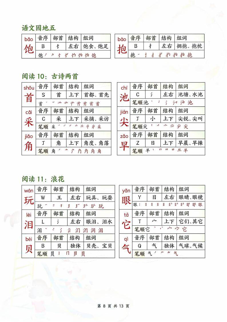 今天为大家分享:25春新一年级下册语文生字课课贴,共 13 页。依据一年级语文下册的课文顺序,对各篇课文及语文园地中的生字进行了系统整理。每个生字都详细标注了音序、部首、结构、组词以及笔顺等内容,是辅助一年级学生学习生字、夯实语文基础的实用资料。对于刚接触大量生字的一年级学生来说,准确掌握字音是首要任务。课课贴中清晰标注了每个生字的读音,如 “吹(chuī)”“晴(qíng)” 等,帮助学生建立正确的语音认知,避免因方言或其他因素导致的发音错误,为今后的口语表达和朗读奠定良好基础。
