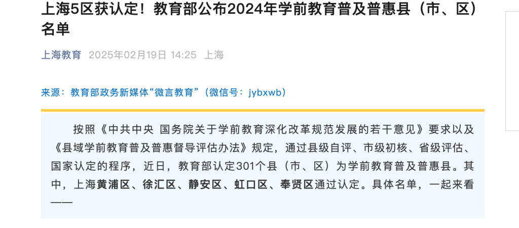 2月19日,“上海教育”发布稿件《上海5区获认定!教育部公布2024年学前教育普及普惠县(市、区)名单》。